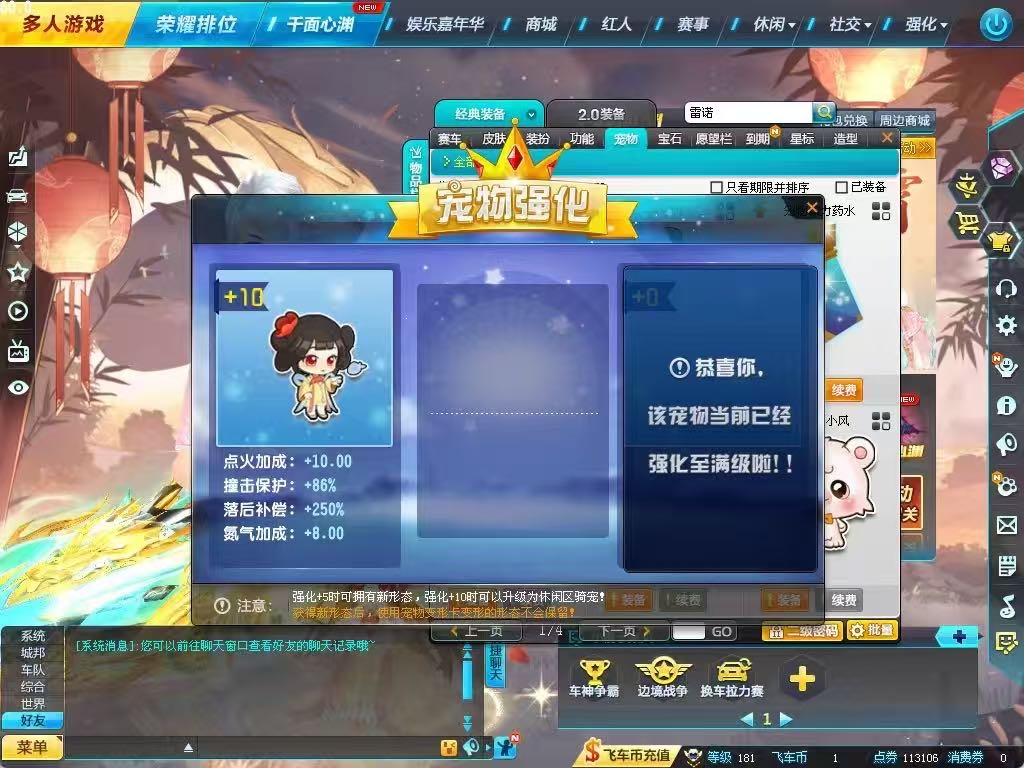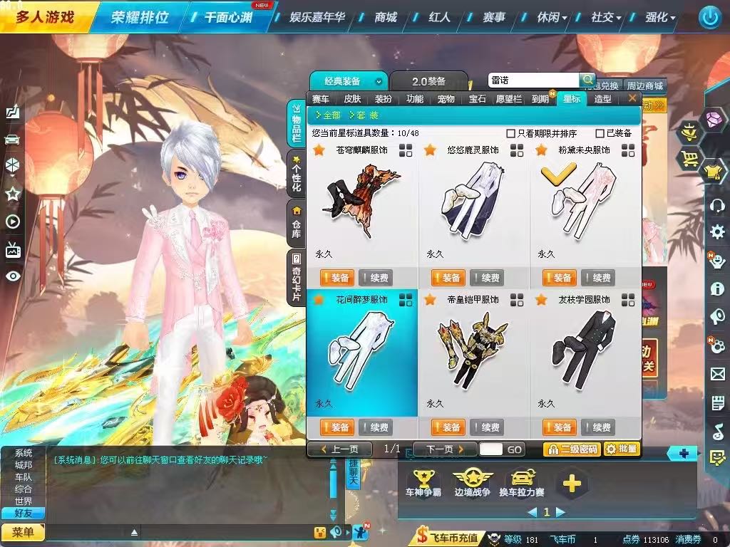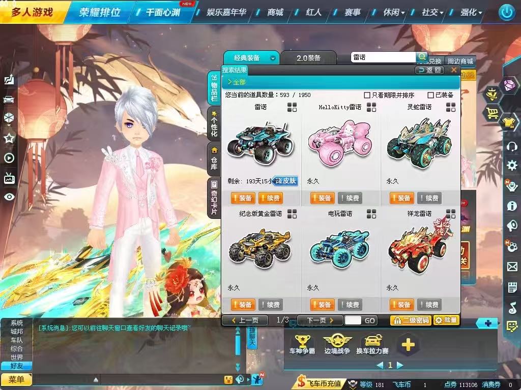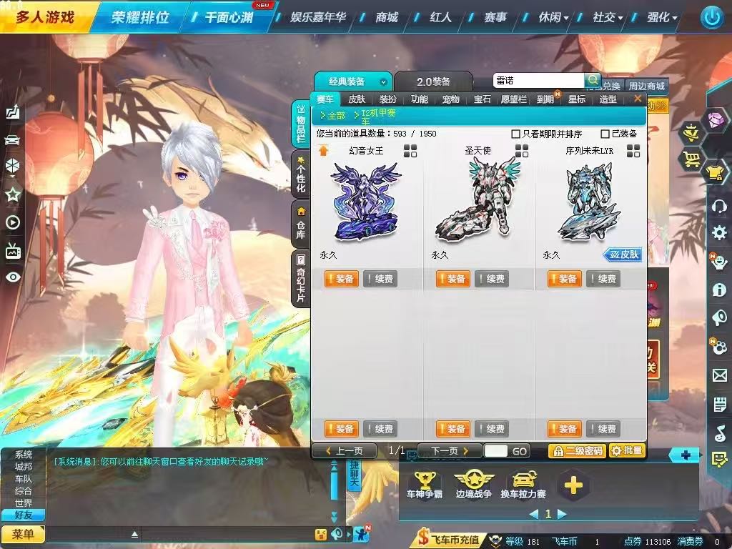 2S:全29双四至尊玉麒麟,全29双四百变小樱,3T2:全29满四幻音女王,列未来,圣天使,2T1:星际探索者,传武之魂,13A:29祥龙雷诺,灵蛇雷诺,HelloKitty雷诺,地狱雷诺,电玩雷诺,纪念版黄金雷诺,14骑宠:小贵妃强10,小关羽强10,小貂蝉强5,套装:男装14页,男发饰14页,女装7页,女发饰6页,悬浮:悠悠鹿灵男,苍弯麒麟男,天籁之声男女,动作:友枝学园男女,帝皇铠甲男,