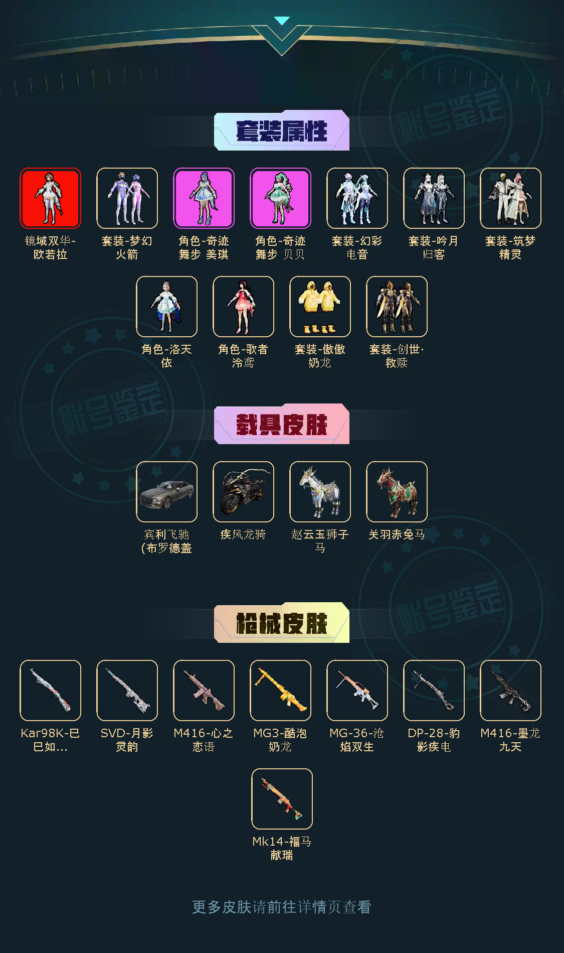 【稀有资产】镜域双华-欧若拉[4级]/M416-心之恋语/M416-墨龙九天/套装-雪山精英/套装-龟仙人/玩偶服-美羊羊/角色-情公主/大砍刀-青龙偃月刀/撬棍-龙胆亮银枪