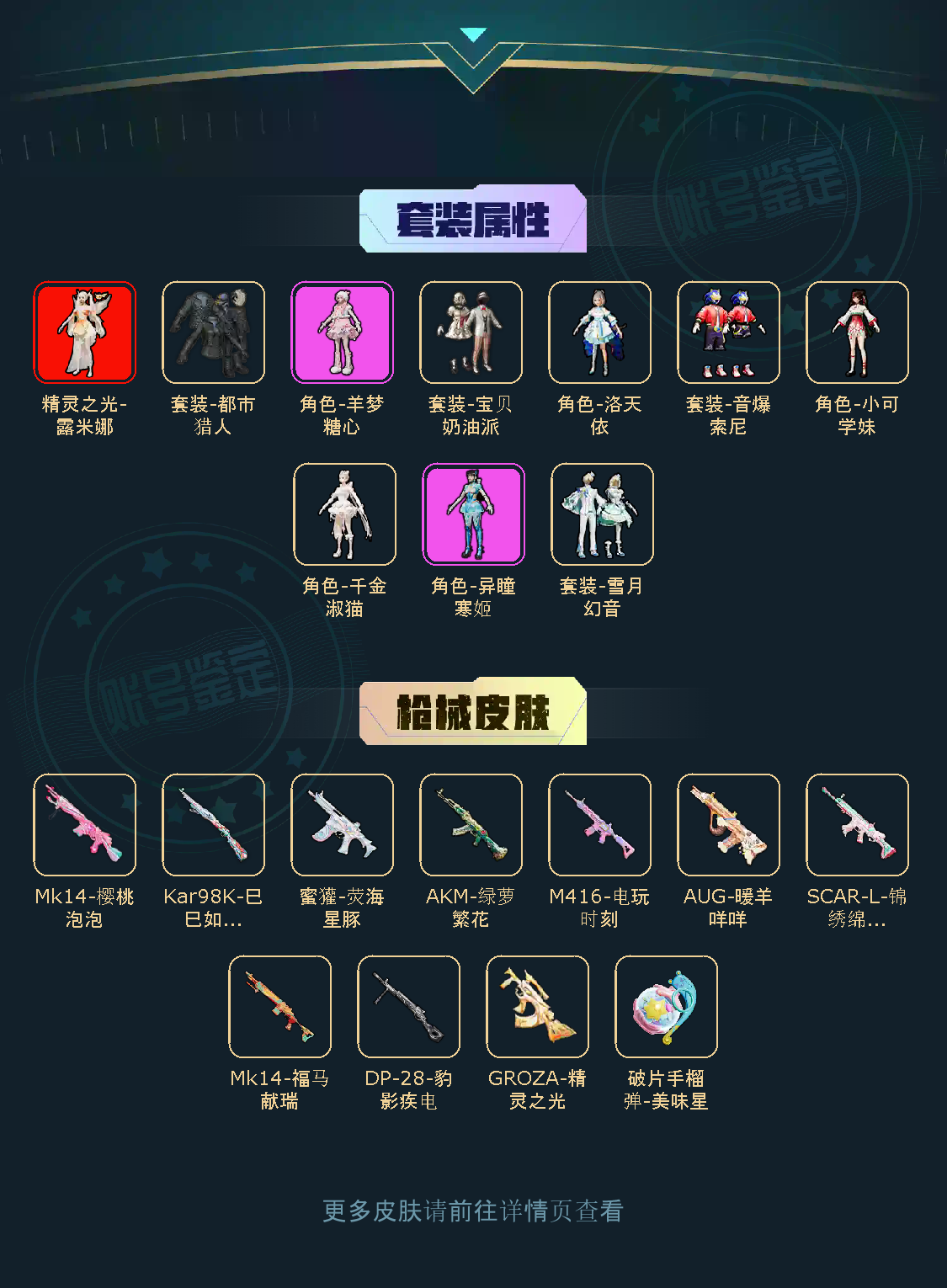 【稀有资产】精灵之光-露米娜[3级]/角色-千金淑猫/角色-羊梦糖心/破片手榴弹-美味星星糖/AUG-暖羊咩咩/M416-电玩时刻/GROZA-精灵之光/套装-都市猎人/套装-浪漫天命/套装-龟仙人/套装-晶辉守护/套装-绒宝小鹅/套装-梦域神使/套装-动感兔斯基人偶服/套装-双彩圣灵/套装-银月精灵/套装-绒绒粉兔/玩偶服-美羊羊/角色-粉雾星云/角色-申公豹/角色-海琴烟