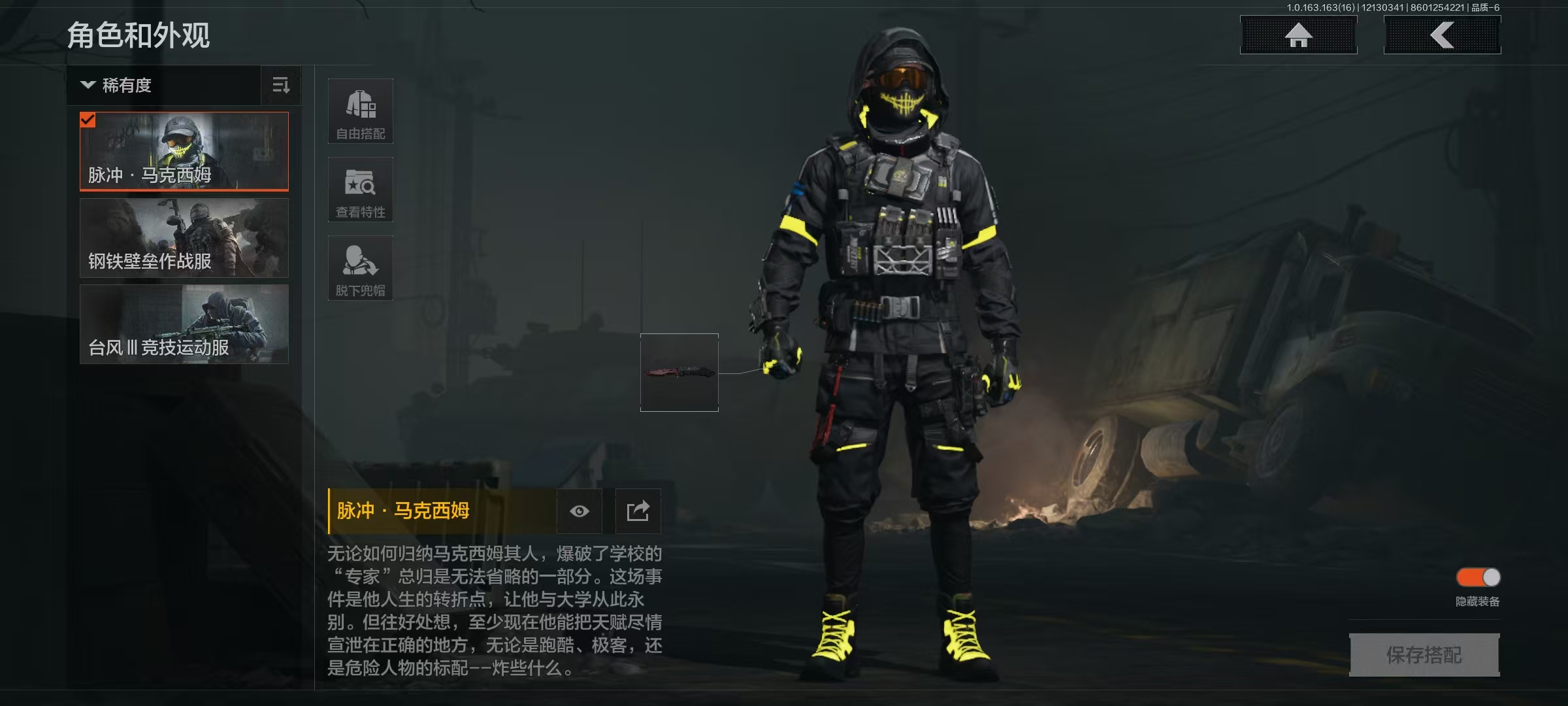 -30级,刀皮6,金枪皮3,紫枪皮39,历史最高段位:暗区传说【角色皮肤】:脉冲马克西姆,钢铁壁垒作战服,台风IV竞技运动服;【上衣】:少前联动AK15;【近战武器】:盘牙彻甲短刃,明刀绣春,冬日冰镐,瑞兔折刀,工兵铲,来战开山刀;【突击步枪】:包络战术AKM,骑士之剑AKM,逆火玄石AKM,棱光裂变AKM,潜渊蛇鳞M4A1,德尔塔小队M4A1,竞技M4A1,竞技MDR,北国内卫MDR,德尔塔小队H416,火绒草AUG,战术大师AK74N,最后防线AKS74U,钢铁真理F2000,炎夏浪花AR57,竞技AR57,棱光裂变ACE31,骑士之剑ACE31,粉绒臻选AN94,北国内卫AN94,巡林客T951,突变系谱T951,利齿风暴T03,迅影毒锋AK12,典礼武备MCX;【冲锋枪】:利齿风暴MPX,龙威MP5,代号天依P90,利齿风暴T79,战术大师Suomi;【射手步枪】:旧王圣谕VSS,玄戈梨花VSS,战术大师SVDS,伦琴计量SVDS,典礼武备MK14,快乐游戏M110;【栓动步枪】:棱光裂变莫辛,战术大师SJ16,骑士之剑SJ16;【轻机枪】:典礼武备M249;【卡宾枪】:粉绒臻选SKS,战术大师SKS