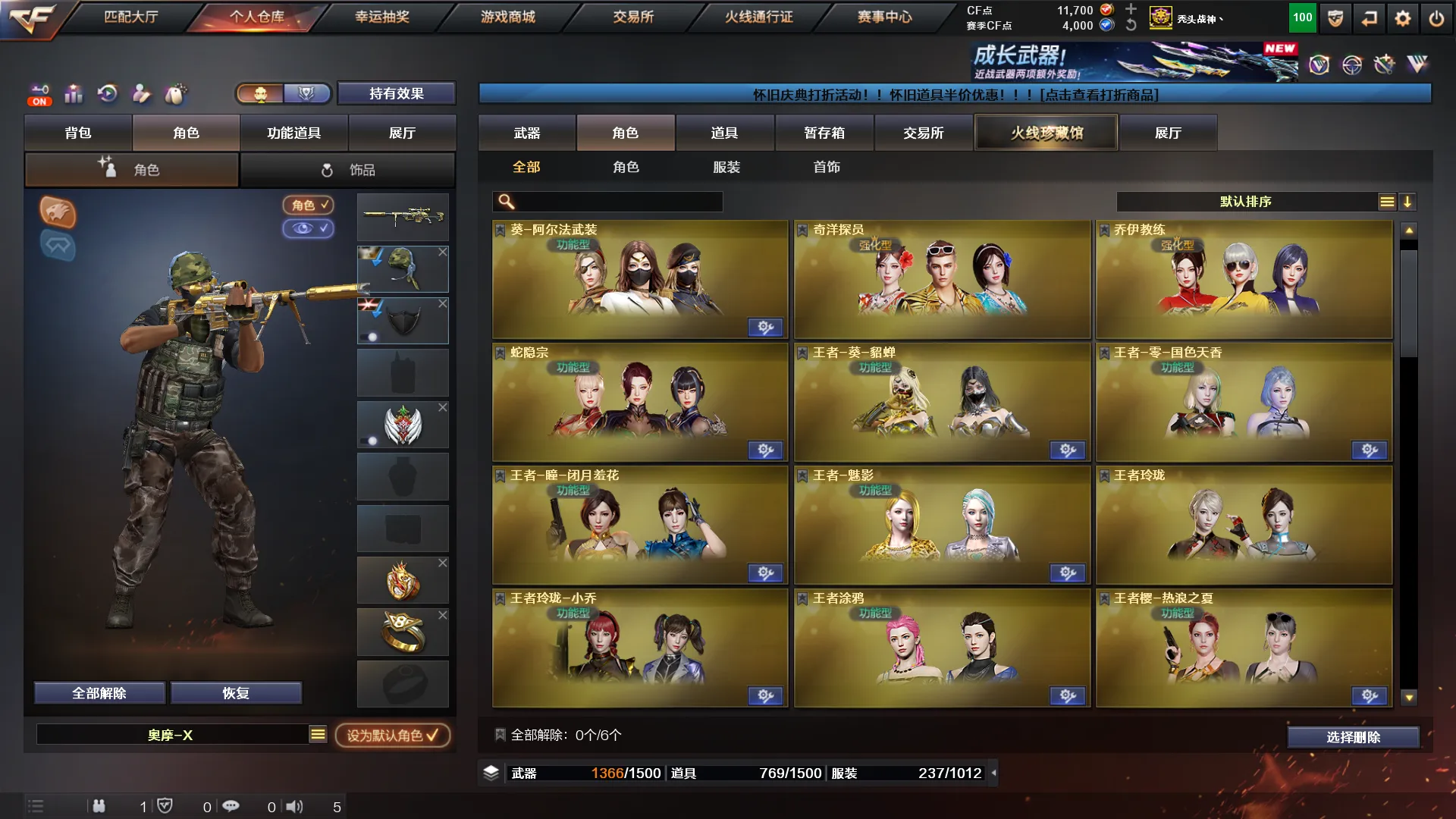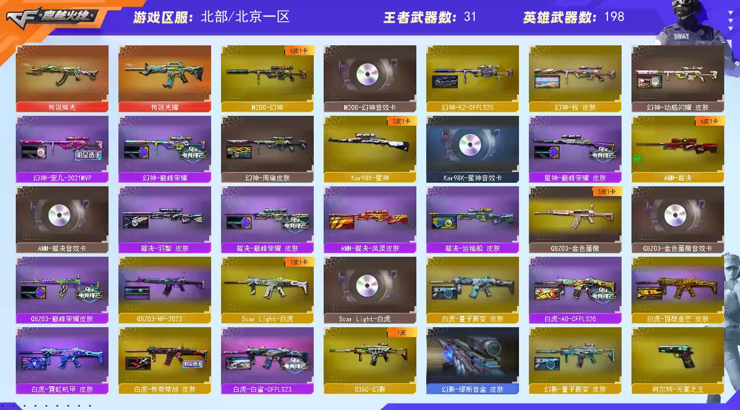 步枪:传说辉光(7k保底出的打人巨痛) 传说光耀 千变 雷神✘2 火麒麟✘2 黑龙 黑武士 qbz03 黑骑士✘7 无影 死神 天启 超新星 机械迷城 黑鲨 龙血 ak雷暴 m4青龙 朱雀 白虎 夜魔 幻灵 玫瑰精灵 猎神 烈火✘4 王者之心 王者之影 王者之翼 王者之武 王者之魄 王者之戮 超新星-悦享 猩红传说ak 战神ak 网剧套装 电玩蓝图白虎。。。 黄金牛牛ak 金色小号 各种小人枪请看图