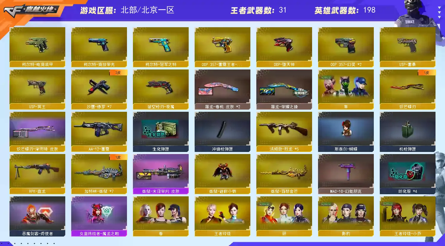 手枪:usp雷暴 天神 修罗✘6 英雄级cop✘4 cop猫猫 破空枪刃夜魔 柯尔特电竞装甲 其它若干