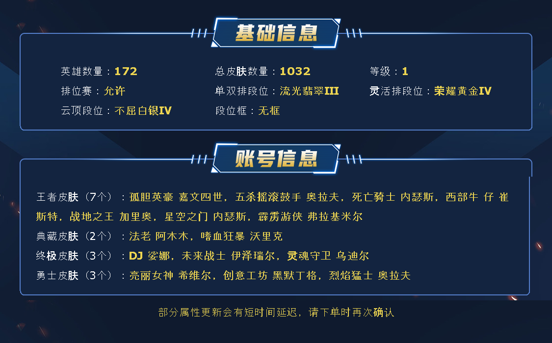 ~~喜欢记得收藏~~可排位~~1032皮全英雄~~租之前尽量查一下游戏ID,确保段位是您需要的,避免浪费您的时间~~请勿挂机逃跑故意送人头,谢谢合作,谢谢~~
