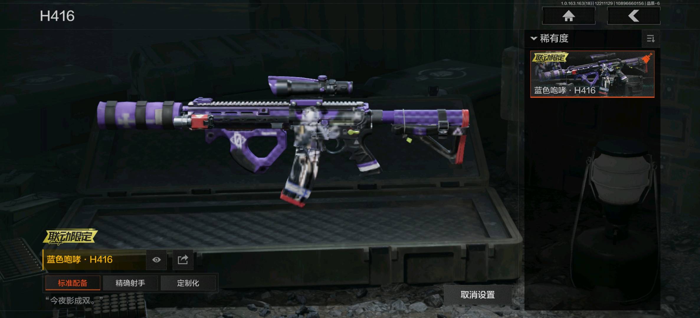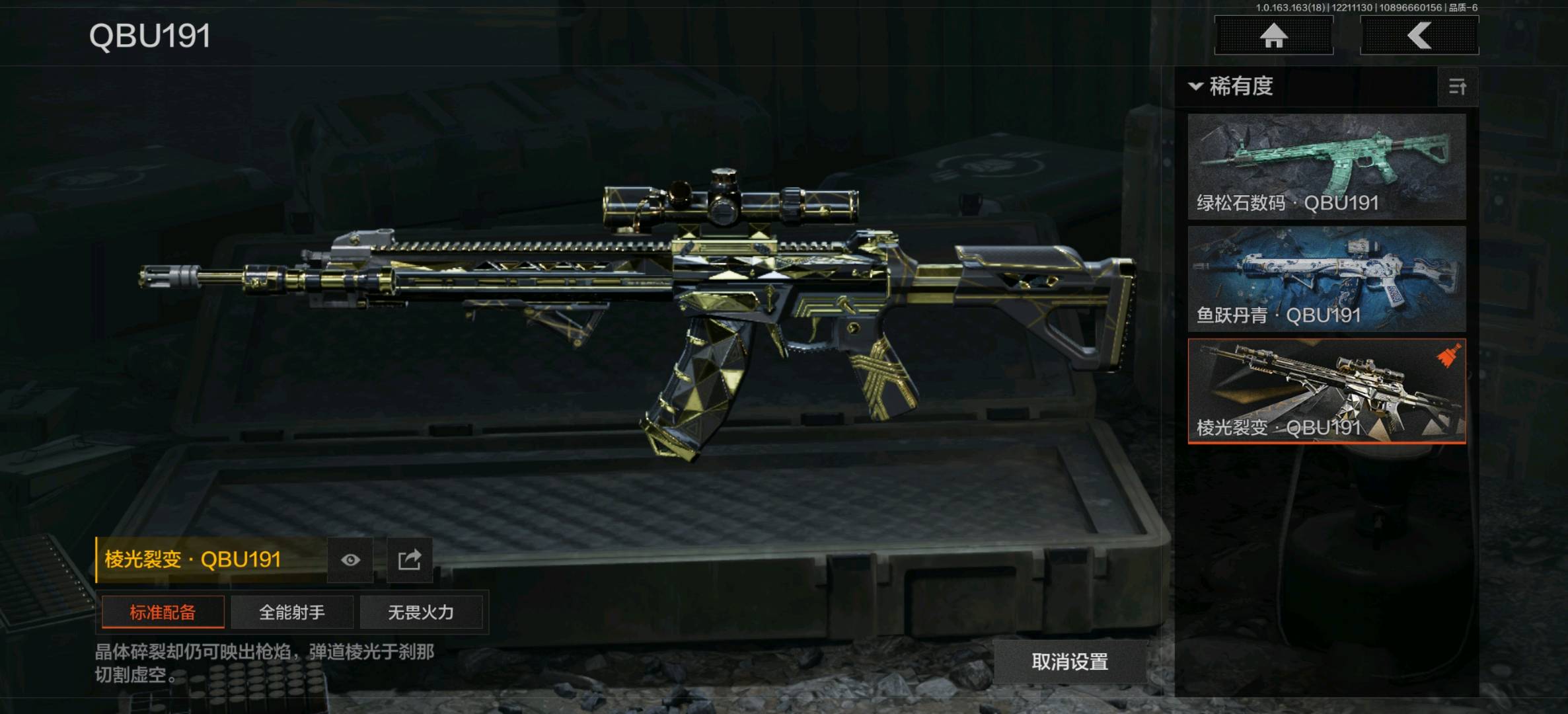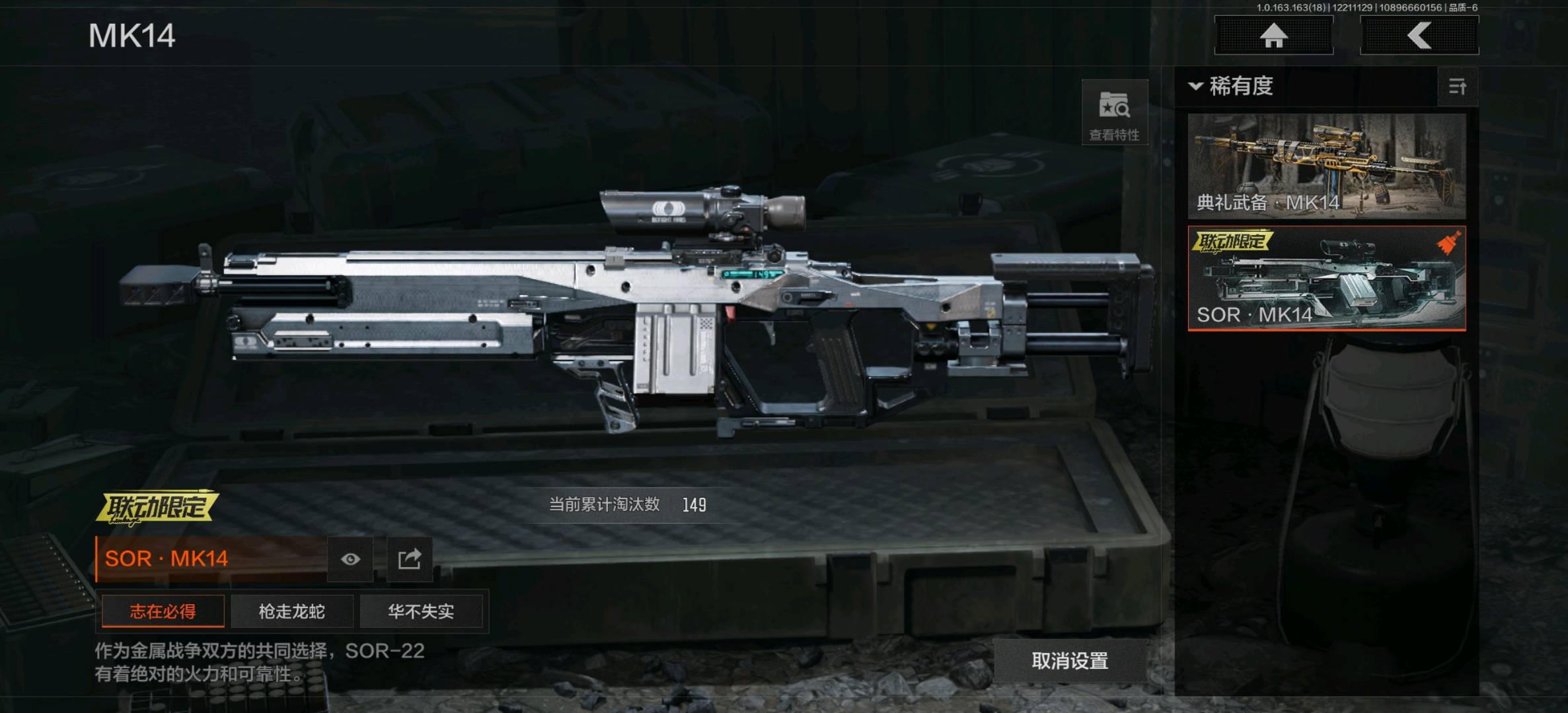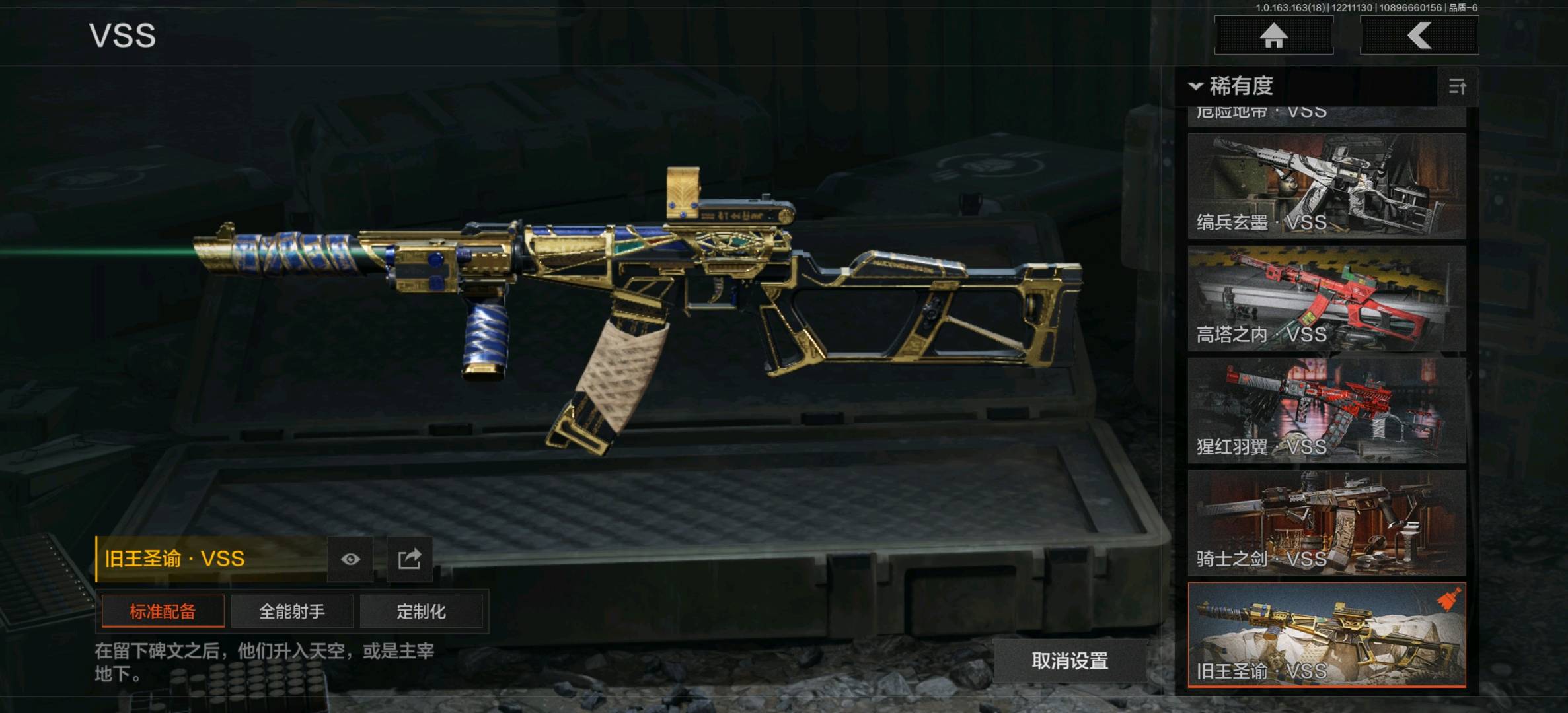 SORMK14,旧王圣谕VSS,骑士之剑VSS,棱光裂变QBU191,高塔之内VSS,缟兵玄墨VSS,典礼武备MK14,鱼跃丹青M110,竞技M110,鱼跃丹青QBU191;棱光裂变莫辛,粉绒臻选AR30,超越自我AR30,战术大师SJ16,骑士之剑SJ16;典礼武备M249;赢家G18C;