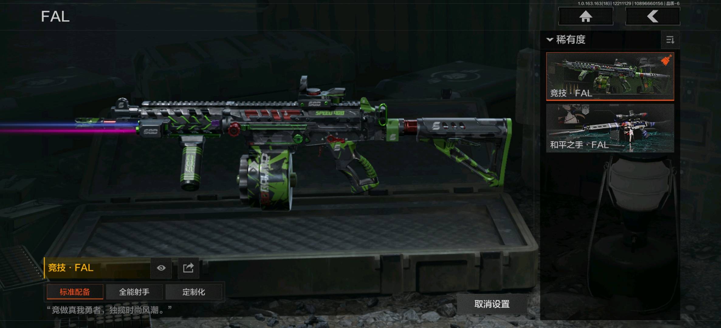 竞技FAL,蓝色咆哮H416,告丧夜曲AUG,旗帜AEK,告丧夜曲AR57,和平之手FAL,骑士之剑AKM,棱光裂变AKM,竞技MDR,棱光裂变AK102,来战AK74N,火力倾泻AUG,火绒草AUG,赢家F2000,钢铁真理F2000,莫克斯AKS74U,骑士之剑AKS74U,最后防线AKS74U,炎夏浪花AR57,涂绘猎人AR57,棱光裂变ACE31,湖冰倒影ACE31,阴影AN94,武侍FAMAS,利齿风暴T03,火绒AK12,飨宴前兆QBZ191,07式林地迷彩QBZ191;利齿风暴MPX,湖冰倒影MP5,骤羽尖啸MPX,高塔之内P90,利齿风暴T79,鱼跃丹青T85,神锋Vector45,超越自我Vector9,战术大师Suomi;