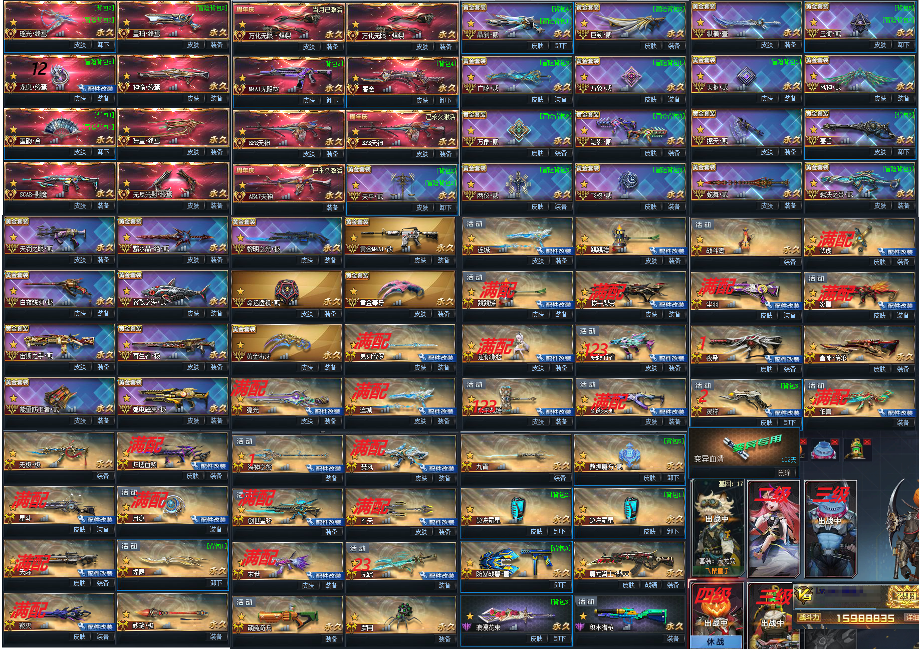 归墟满配 星斗满配 月隐满配 天际满配 蝶舞(蝴蝶刀) 寂灭满配 樊风满配 创世满配 玄天满配 末世满配 无踪23 萌兔骑兵 罗网 九霄 花束 积木猎枪