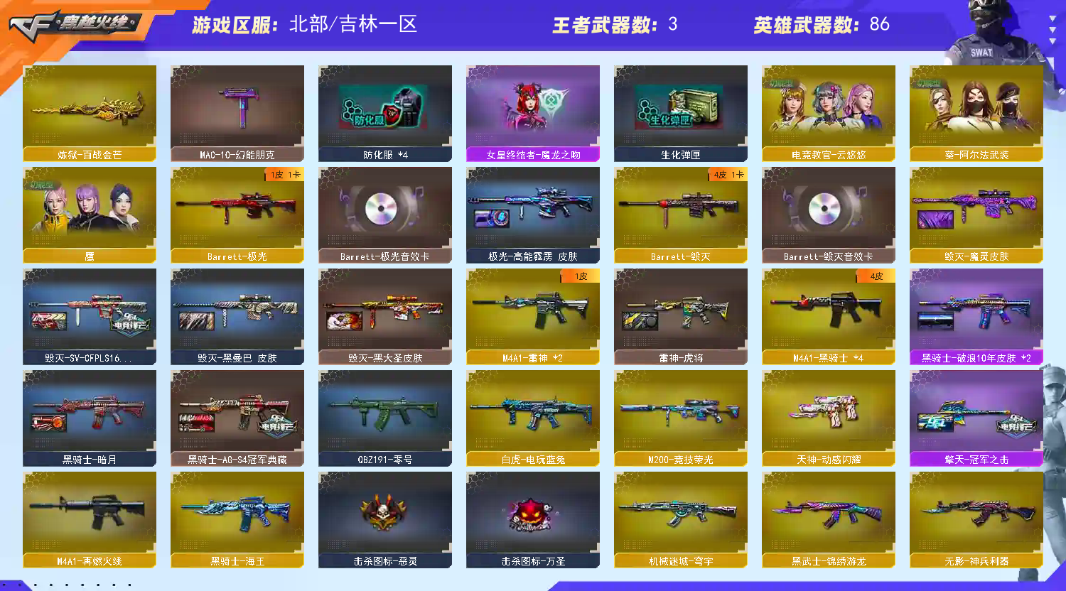 【稀有武器】:传说幽瞳/M200-幻神/Kar98K-星神/G36C-幻影/ScarLight-白虎/USP-雷暴(2)/柯尔特-竞技荣光/天神-动感闪耀/COP357-云龙/柯尔特-荣耀世冠白鲨2023/修罗-古蛇迷踪/COP357-雷霆王者-觉醒版/金色蔷薇-古蛇迷踪/QBZ03-金色蔷薇/M4A1-雷神(2)/M4A1-黑骑士(4)/白虎-电玩蓝兔/Barrett-毁灭/Barrett-极光/AWM-裁决/M200-竞技荣光/汤姆逊-烈龙(3)/炽芒蝶刃/斩神刀-雷暴(2)/幻灵之锋/擎天-竞技荣光(2)/唐刀-神工天巧