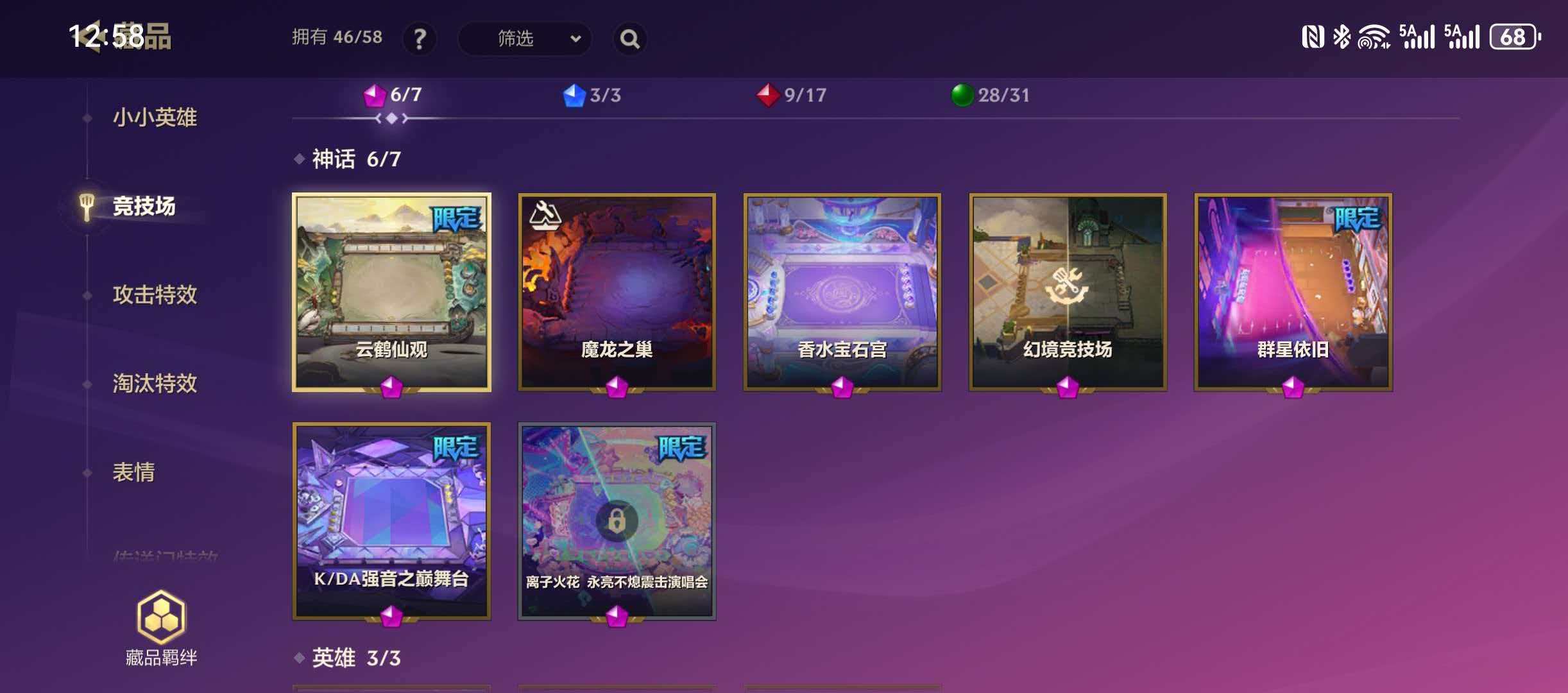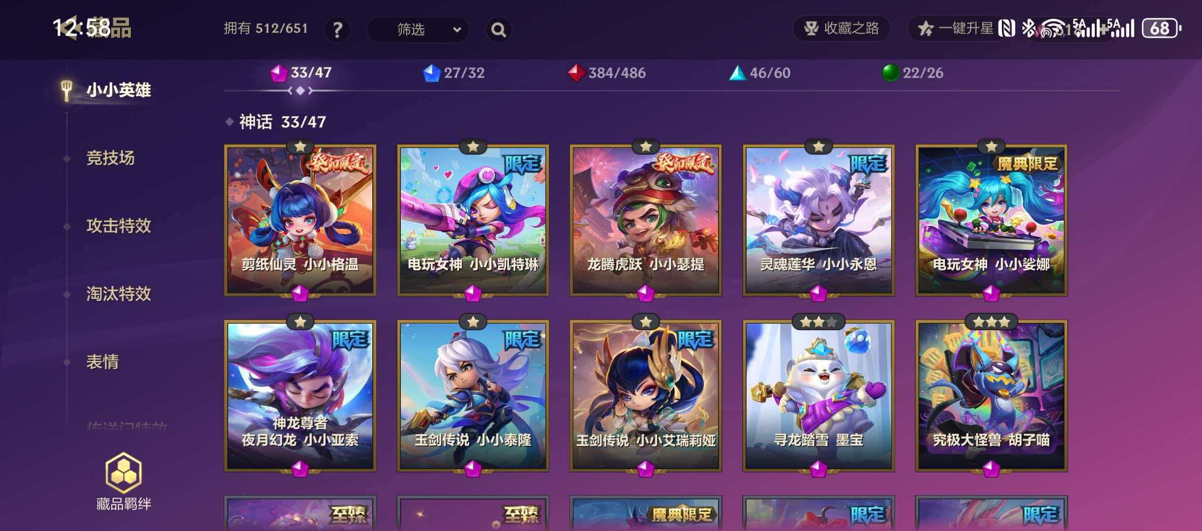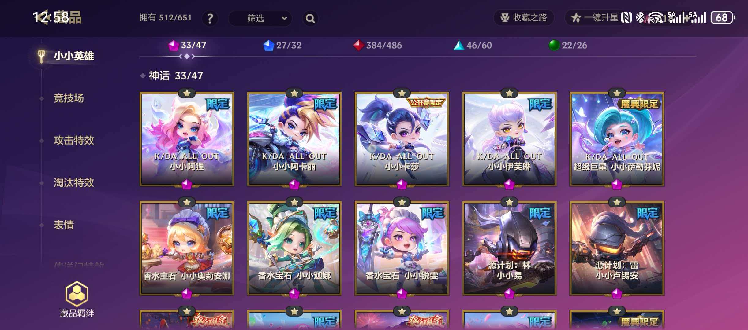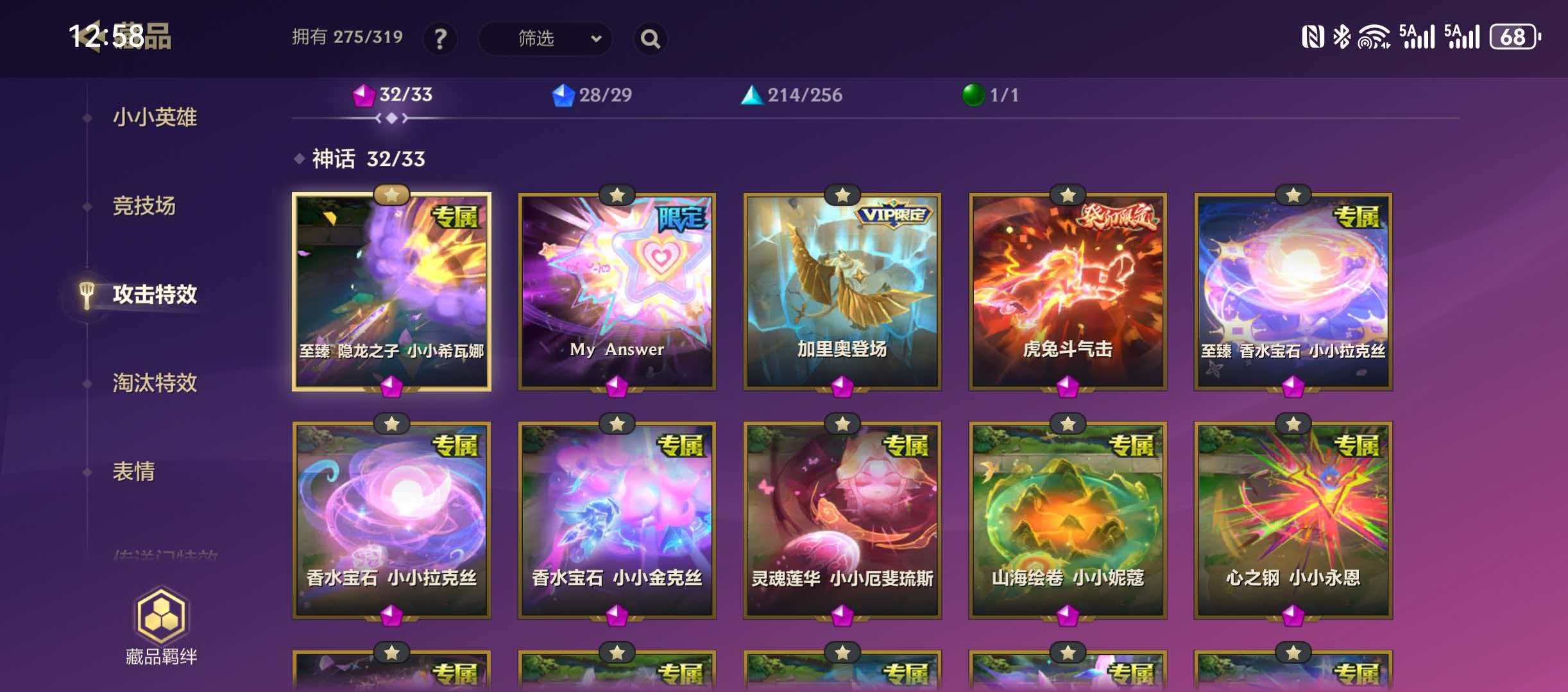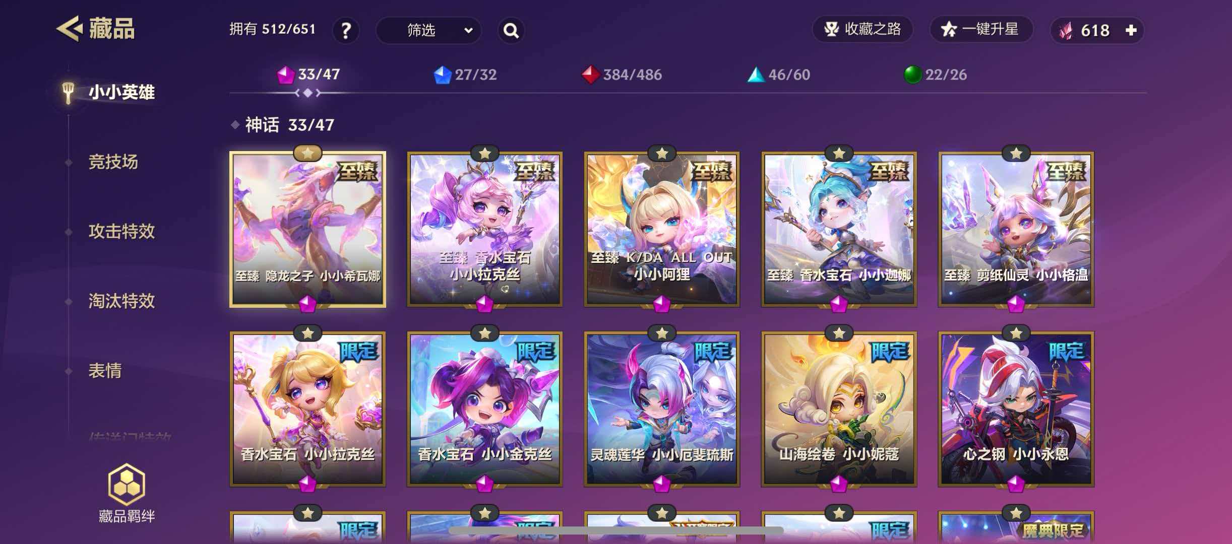 515英雄❤33神话英雄❤46竞技场❤275攻击特效❤KDA淘汰特效❤13传送门❤至臻格温 拉克丝