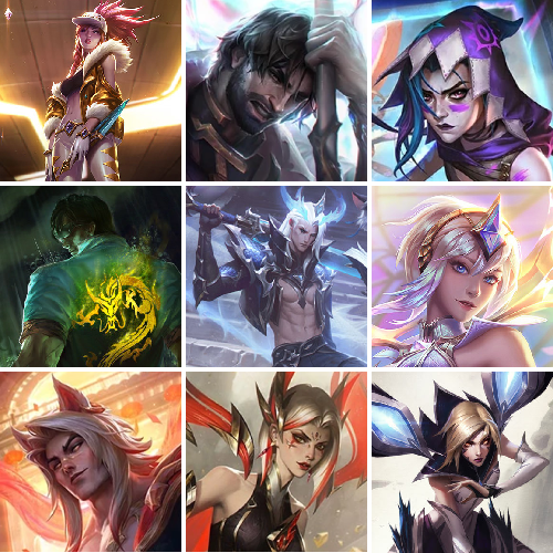 全英雄,1497原皮,可排位,氪金神话,黑夜使者神话亚索,圣堂金克丝,圣堂腕豪,冠军皮肤全套,战队签名皮肤。