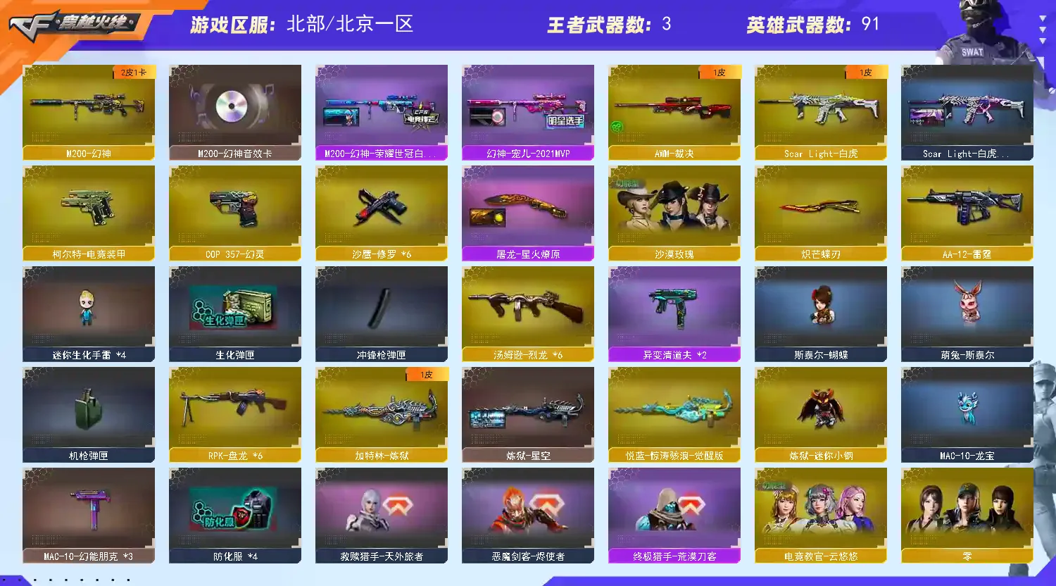 沙漠玫瑰+龙宝+蝴蝶刀+幻神宠儿白鲨三件套+六烈+蝴蝶萌兔清道夫✨裁决+皮✨白虎+皮✨六盘+小刚骇浪。弹夹齐全