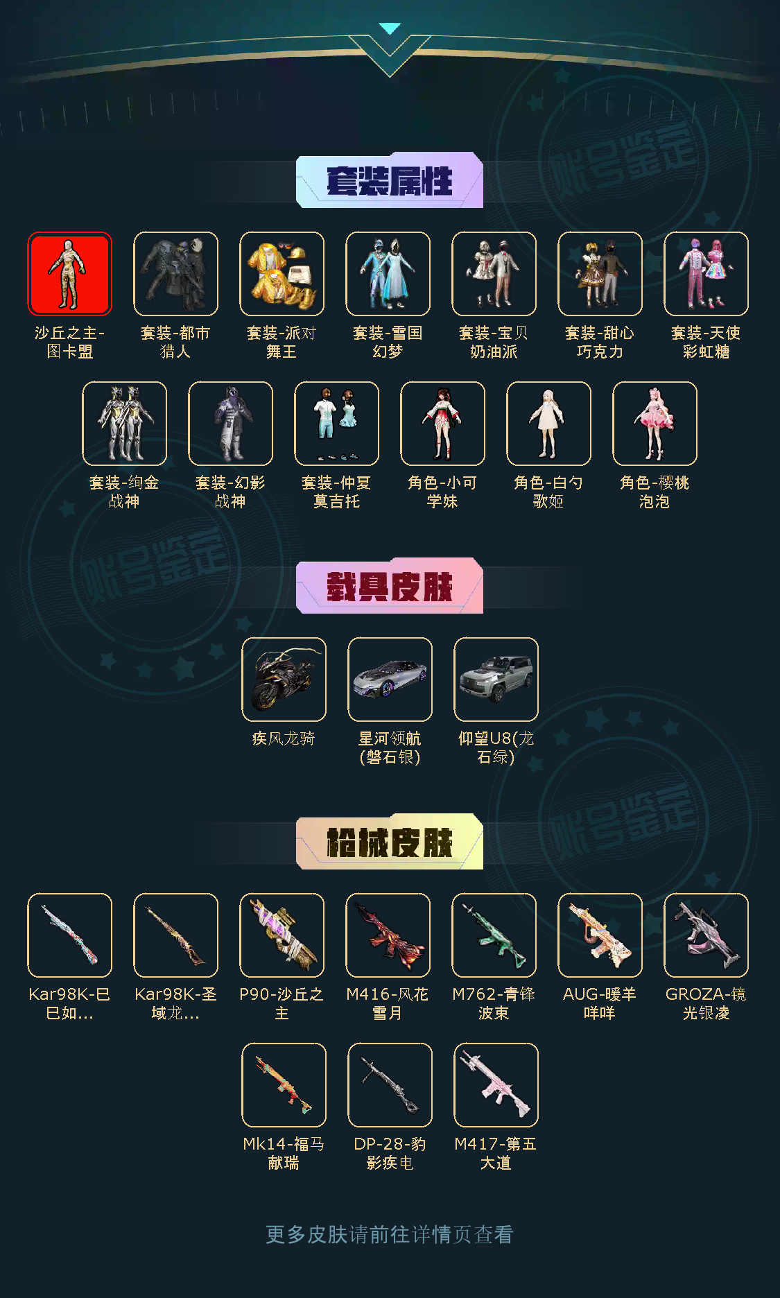 【稀有资产】沙丘之主-图卡盟[4级]/套装-雪国幻梦/M416-风花雪月/AUG-暖羊咩咩/套装-派对舞王/套装-深海小丑鱼/套装-寒蝎幽灵/套装-都市猎人/套装-暗影哥特/套装-胖达团团/套装-晶辉守护/套装-绒宝小鹅/套装-纯白跃动/套装-萌神柯基/套装-青涩年华/套装-冷酷挑战者/套装-西部牛仔/角色-摩登魅猫/角色-俏兔智灵/角色-冰公主/角色-海琴烟