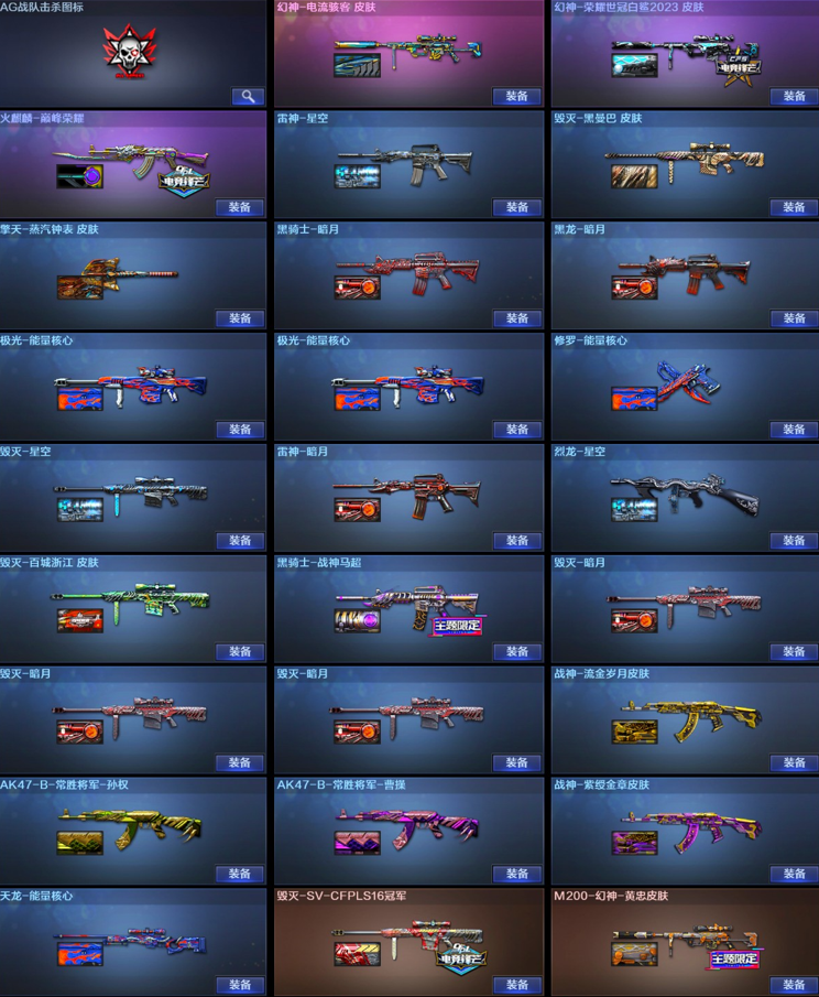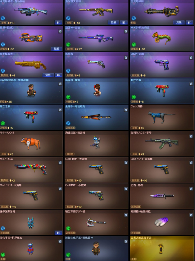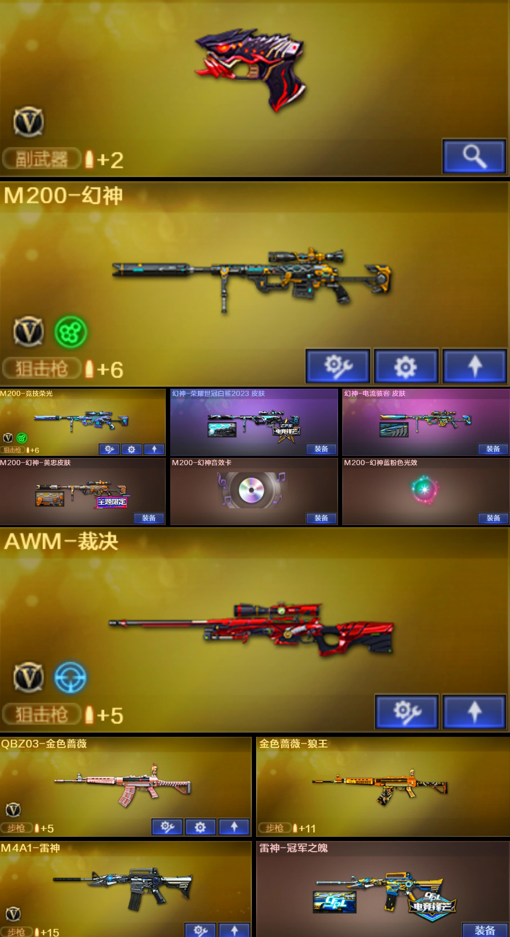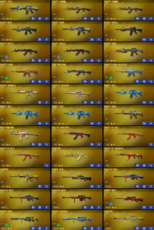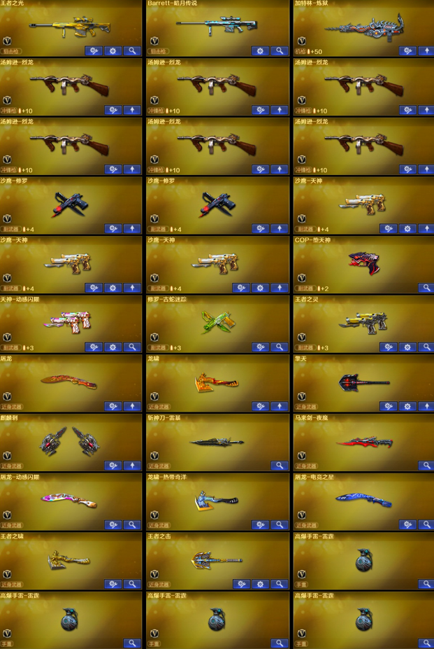【稀有武器】:M200-幻神/HK417-朱雀/COP-堕天神/天神-动感闪耀/修罗-古蛇迷踪/QBZ03-金色蔷薇/AK47-火麒麟(2)/M4A1-黑龙/M4A1-雷神/M4A1-黑骑士/AK47-黑武士(2)/Barrett-毁灭(2)/Barrett-极光/AWM-裁决/M200-竞技荣光/加特林-炼狱/汤姆逊-烈龙(6)/斩神刀-雷暴/马来剑-夜魔