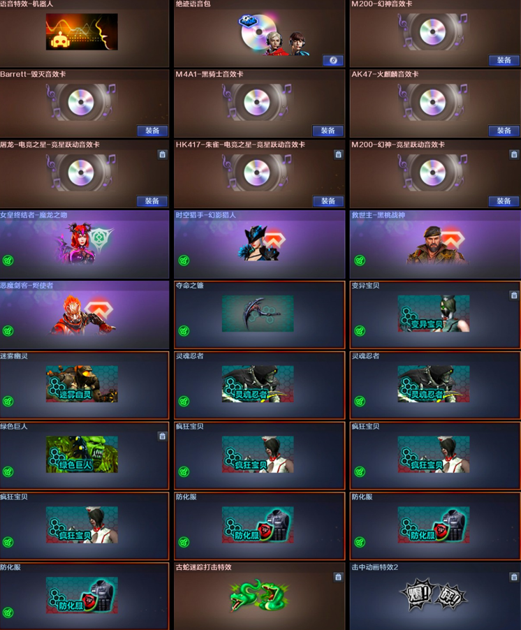 【热门音效卡】:M200-幻神音效卡/Barrett-毁灭音效卡/M4A1-黑骑士音效卡/AK47-火麒麟音效卡