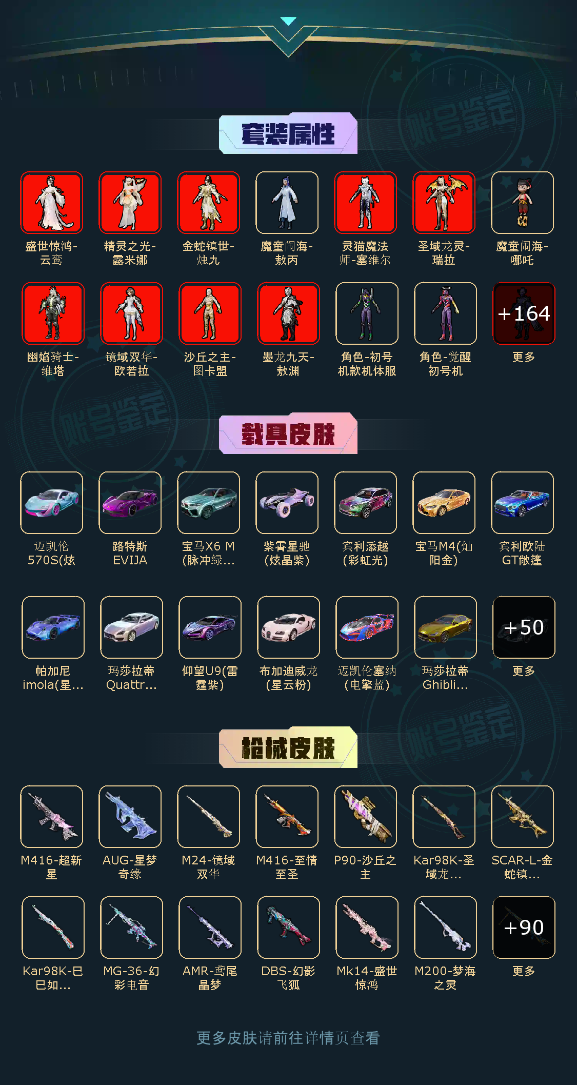 卓越王牌7星169粉,61载具,683套装,19王牌印记,无敌战神历史最高段,616671热力值 平底锅-仲夏莫吉托/平底锅-林间仙鹿/Famas-初号机 觉醒Ver./AKM-甜心宝贝/SCAR-L-梦幻火箭/SCAR-L-童趣迷兔/AUG-星梦奇缘/M416-风花雪月/AUG-星之彼岸/SCAR-L-甜梦小狐/M762-甜心娃娃/M762-电糖天使/GROZA-旋转彩虹/GROZA-香水柠檬/M416-暖熊萌萌/AKM-幽焰骑士/SCAR-L-天蓬元帅/Famas-觉醒初号机/M416-心之恋语/SCAR-L-纯梦嫁纱/GROZA-超新星/M16A4-葫芦兄弟/M416-五爪金龙/AKM-魔法神域/M16A4-垂柳戏鸭/AKM-炫紫旋律/AKM-白勺歌姬/GROZA-精灵之光/M416-墨龙九天/GROZA-焦糖拿铁/M762-冷魅冰骑/AKM-百合蜜语/M416-至情至圣/SCAR-L-时空协奏/SCAR-L-金蛇镇世/AUG-妙趣可丽/M762-甜蜜誓约/AUG-超新星/SCAR-L-机甲封神/M416-超新星/M16A4-晶梦幻蝶/AKM-梦之光华/SPAS-12-音爆索尼克/DBS-幻影飞狐/S12K-海渊国主/Mk14-盛世惊鸿/SKS-诡面斩/Mini14-荧光虫舞/Mk14-樱桃泡泡/SLR-暗夜玫瑰/VSS-烈焰拳霸/MK20-H-海螺星光/DP-28-扶摇飞仙/MG3-辉羽雀灵/DP-28-枪炮玫瑰/DP-28-幻梦音符/PKM-守护天翼/DP-28-金蝉行者/MG3-洛神天依/M249-古战神甲/MG-36-幻彩电音/M249-绒雪飘舞/M249-蓝莓炮弹/DP-28-豹影疾电/UZI-绮梦青鸾/P90-仙履奇缘/P90-电糖天使/汤姆逊-怪笑疯兔/Vector-红伞翩翩/P90-甜蜜草莓/P90-能量风暴/UMP45-宇宙意志/UMP45-雪国精灵/UMP45-相思残雪/UMP45-恐龙拽拽/野牛-流星咚咚/P90-沙丘之主/汤姆逊-冰川粉黛/UMP45-玉魂晶魄/P90-魔童闹海 敖丙/爆炸猎弓-雪梅暗香/燃点复合弓-时空协奏/烟雾弹-猫咪绅士/破片手榴弹-粉粉猫爪/AWM-璀璨巨星/Kar98K-伏魔团/Kar98K-圣域龙灵/AWM-花间之火/AWM-焰龙焚天/AMR-鸢尾晶梦/Kar98K-巳巳如意/Kar98K-创世·救赎/Kar98K-圣光天使/AWM-橘柚倾心/M24-镜域双华/AMR-炫光之旅/M200-玉鳞金羽/M200-梦海之灵/Kar98K-暗翼战神/M24-星之信仰/Kar98K-绿意幻情/玛莎拉蒂Ghibli(金)/玛莎拉蒂Ghibli(蓝)/兰博基尼Estoque(炫光金)/宝马M4(灿阳金)/玛莎拉蒂Quattroporte夜幕蓝/星河领航(炫晶粉)/天马凌跃(闪耀金)/玛莎拉蒂Quattroporte(幻星粉)/玛莎拉蒂Ghibli(粉)/虚妄之影(炫耀紫)/宾利欧陆GT敞篷(深空蓝)/萌喵橘座/越野奶龙龙/路特斯ELETRE(冰川蓝)/宝马X6 M(脉冲绿)/擎天重拳/宾利添越(彩虹光)/南瓜骑士/拉轰鸭鸭车/鬼马风驰/快艇-自由的鲸/快艇-塞莎KL27(霓虹粉)/快艇-瑞蒂奥Espera 34(宝石蓝)/特斯拉Cybertruck(极昼黑)/金龙耀世/灵鼠银迹/飞驰奶龙龙/Formula E Gen2(巅峰兰)/紫霄星驰(炫晶紫)/糖心拉力赛车(炫动紫)/羁绊之心/迈凯伦570S(炫冰蓝)/宝马i8(引力蓝)/路特斯EVIJA(电光紫)/仰望U9(雷霆紫)/布加迪威龙(星云粉)/宾利BATUR(星火红)/迈凯伦塞纳(电擎蓝)/帕加尼imola(星空蓝)/幽澜尊爵(静谧蓝)/兰博基尼SVJ(炫光金)/冰辰御座(钻石蓝)/暮色幽蹄/冰绡玉鳞/护世瑞兽/星梦玉骢/关羽赤兔马/赵云玉狮子马/黑曜夜骑/晶梦灵驹/照夜玉狮子/兰博基尼Aventador SVJ(炫光金)/疾风龙骑/杜卡迪 Panigale V4(星耀白)/辉羽雀灵自行车/双人摩托-梦幻火箭/圣光之翼(梦幻鎏光)/布尔玛摩托车/双人摩托-双刃魅影(红)/幽焰风驰摩托车/极速兔兔/盛世惊鸿摩托车/杜卡迪PanigaleV4(杜卡迪红)/