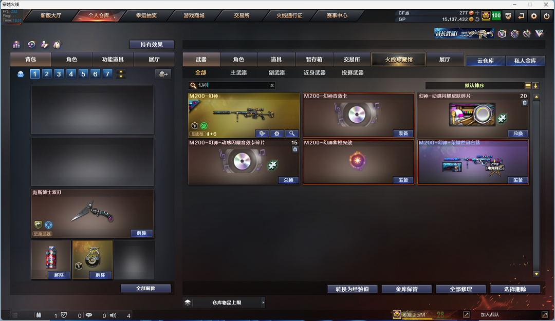 本游戏账号:英雄武器52个; 王者武器0个。 装备不多,但是主武器、副武器、近身武器够用 拥有完美游戏体验。重要的是,特殊装备有:柯尔特-竞技荣光、擎天-竞技荣光、闪光弹-竞技荣光、高爆手雷-竞技荣光、烟雾弹-竞技荣光、QBZ03-金色蔷薇、M200-幻神、USP-神工天巧、唐刀-神工天巧、闪光弹-神工天巧、烟雾弹-神工天巧、高爆手雷-神工天巧、M4A1-神工天巧、M4A1-黑骑士、M4A1-雷神、AK47-火麒麟、堕天使、QBZ03-天罚 音效卡、生化弹匣、M200-幻神音效卡、等,随意畅选。