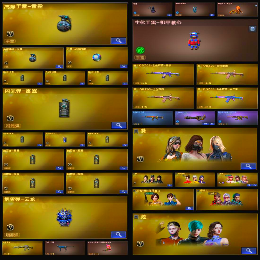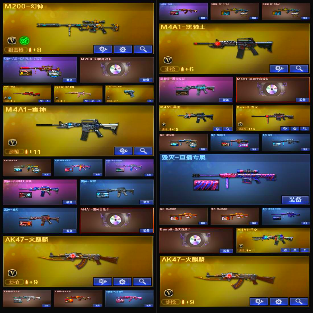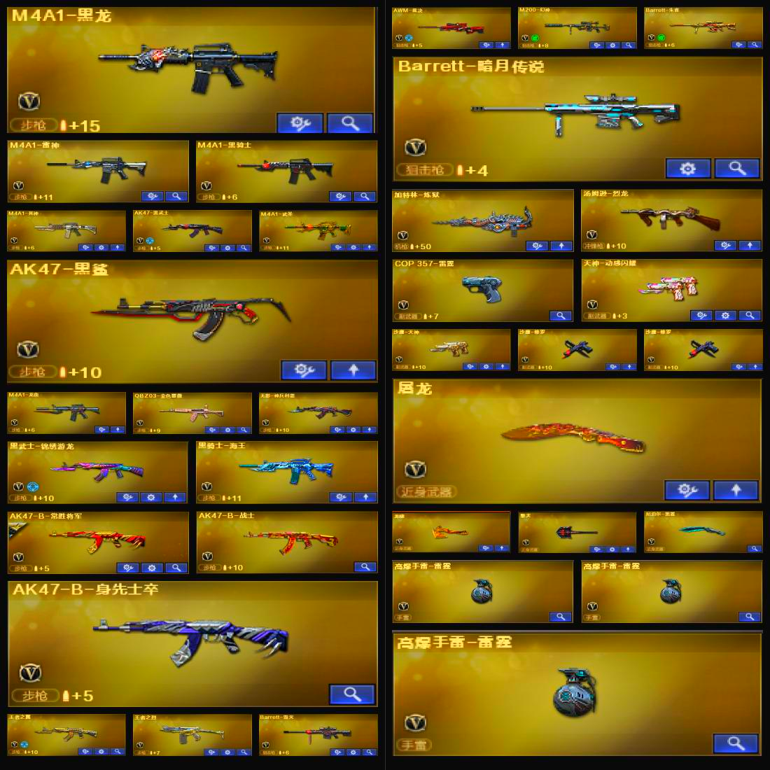 M4A1-死神;M4A1-武圣;M4A1-千变;M4A1-黑骑士;AK47-黑武士;屠龙;龙啸;AK47-火麒麟;AWM-天龙;Barrett-毁灭;汤姆逊-烈龙;沙鹰-修罗;加特林-炼狱;沙鹰-天神;M4A1-雷神;M4A1-黑龙;M200-幻神;烟雾弹-雷霆;闪光弹-雷霆;高爆手雷-雷霆;AK-47-猩红传说;无影-神兵利器;Barrett-暗月传说;QBZ03-金色蔷薇;M4A1-仙界-黑骑士;M4A1-十二生肖·龙-雷神;手雷-动感闪耀;天神-动感闪耀;黑武士-锦绣游龙;烟雾弹-云龙;闪光弹-云龙;擎天;AWM-裁决;AK47-B-常胜将军;AK47-B-身先士卒;擎天-惨叫迹;雷霆之契;雷霆之锋;黑骑士-海王;AK47-黑鲨;AK47-B-战士;M4A1-龙血;Barrett-朱雀