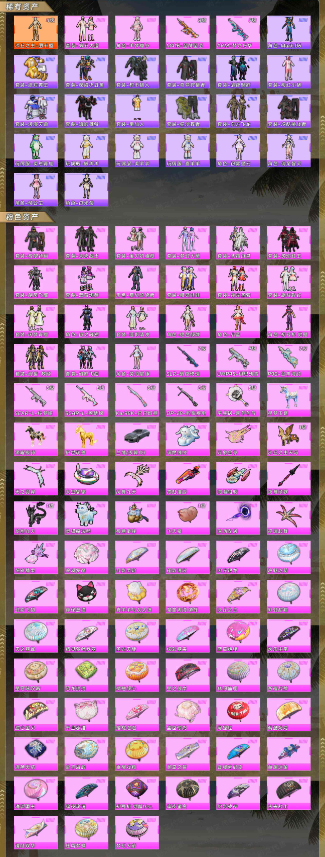 【稀有资产】沙丘之主-图卡盟[4级]/套装-第五大道/角色-羊梦糖心/M416-至情至圣/AKM-梦之光华/角色-Mark.06/套装-派对舞王/套装-深海小丑鱼/套装-都市猎人/套装-奇异狩猎者/套装-暗夜魅影/套装-粉红小猪/套装-浪漫天命/套装-暗影哥特/套装-龟仙人/套装-狂沙舞者/套装-东方飞龙/套装-冷酷挑战者/玩偶服-卖崽青蛙/玩偶服-懒羊羊/玩偶服-美羊羊/玩偶服-喜羊羊/角色-粉雾星云/角色-俏兔智灵/角色-情公主/角色-白光莹