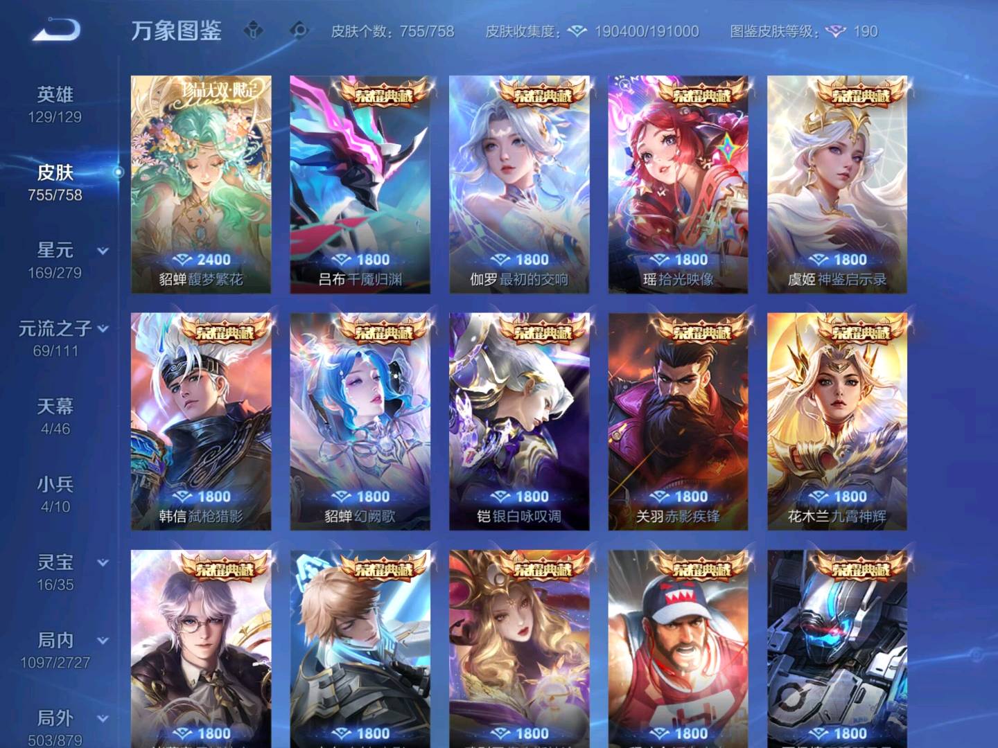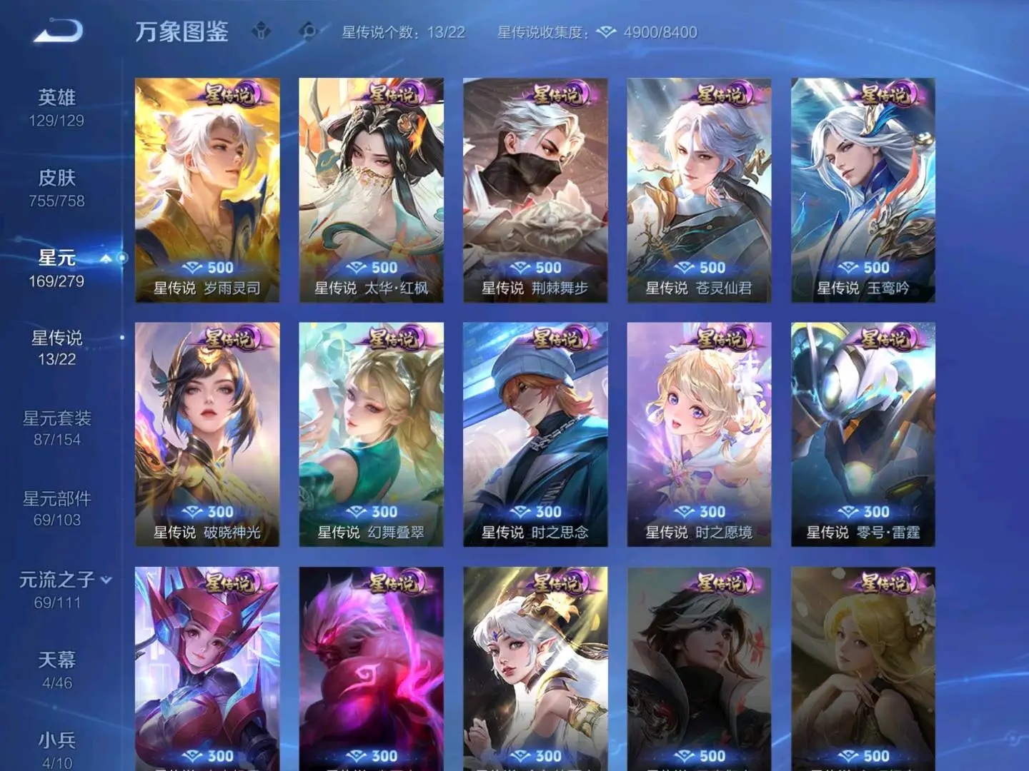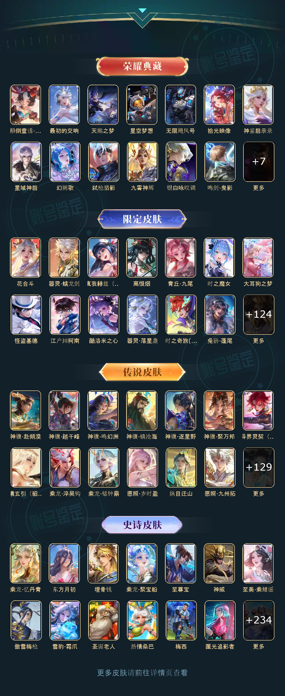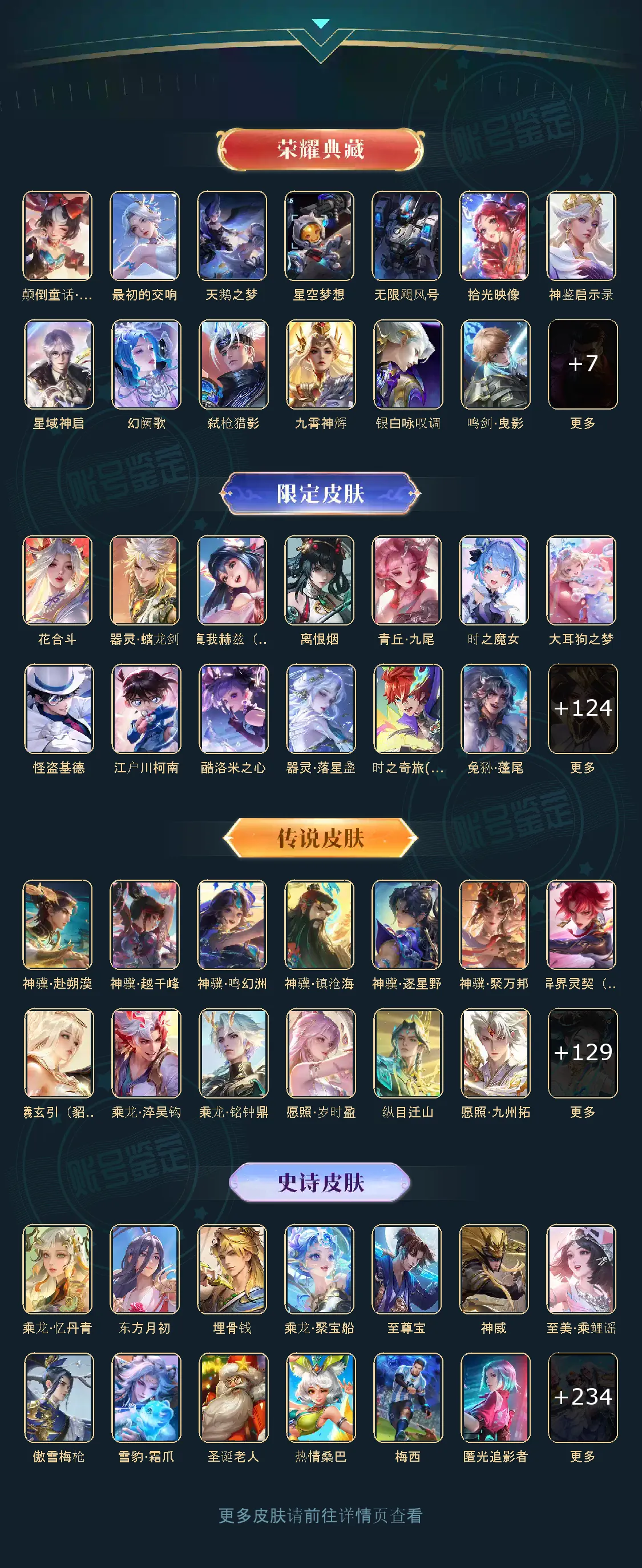 天鹅之梦,星空梦想,无限飓风号,鸣剑·曳影,神鉴启示录,赤影疾锋,星域神启,幻阙歌,拾光映像,最初的交响,弑枪猎影,九霄神辉,银白咏叹调,器灵·螭龙剑,神器·明辉仪,群星魔术团(韩信),真我赫兹(瑶),离恨烟,碎月剑心,雪境奇遇(甄姬),青丘·九尾,时之魔女,馥梦繁花,天魔缭乱,白虎志,默契交锋(兰陵王),李逍遥,默契交锋(花木兰),零号·赤焰,大耳狗之梦,怪盗基德,炽阳神光,江户川柯南,圣诞老人,热情桑巴,梅西,乘龙·问璇玑,乘龙·淬吴钩,乘龙·铭钟鼎,愿照·岁时盈,乘龙·聚宝船,乘龙·忆丹青,酷洛米之心,至尊宝,神威,纯白花嫁,真爱至上,纵目迁山,愿照·九州拓,愿照·众生和,匿光追影者,天机白泽,冥王哈迪斯,心动手记(朵莉亚),时之奇旅(大乔),时之奇旅(鲁班七号),落雪白狼,愿照·福禄聚,无双飞将,至美·化雀舞,时之祈愿瑶,遇见神鼓,挚爱之约,挚爱花嫁,花合斗,霜北刀,逐花归海,器灵·落星盏,琥珀纪元(马超),九山相柳,至美·乘鲤谣,鹤羽星尊,时之奇旅(孙策),曦玄引(貂蝉),愿照·千秋盛,霜月吟,东方月初,妄想实况,埋骨钱,深海之息,黄金天蝎座,夜礼服假面,兔狲·蓬尾,补天,惊梅引,续相思,异界灵契,祥瑞亨通,黑崎一护,启示之音,影龙天霄,心动手记(海诺),神树通天,朽木白哉,云诺千山,鹤归松栖(云缨),愿照·山河定,千劫归真,傲雪梅枪,雪豹·霜爪,神罪