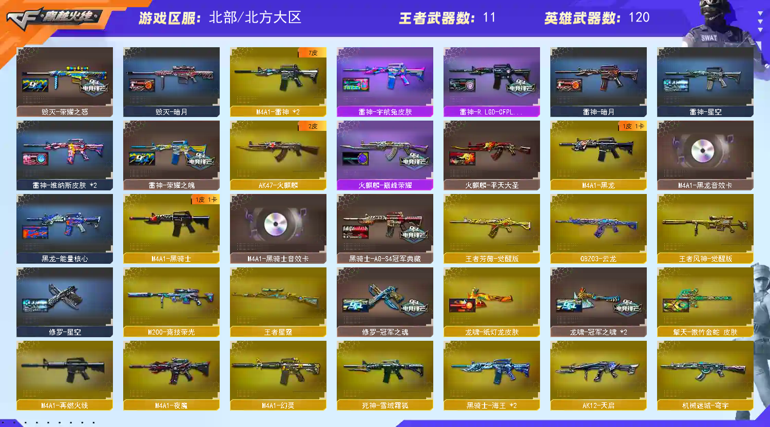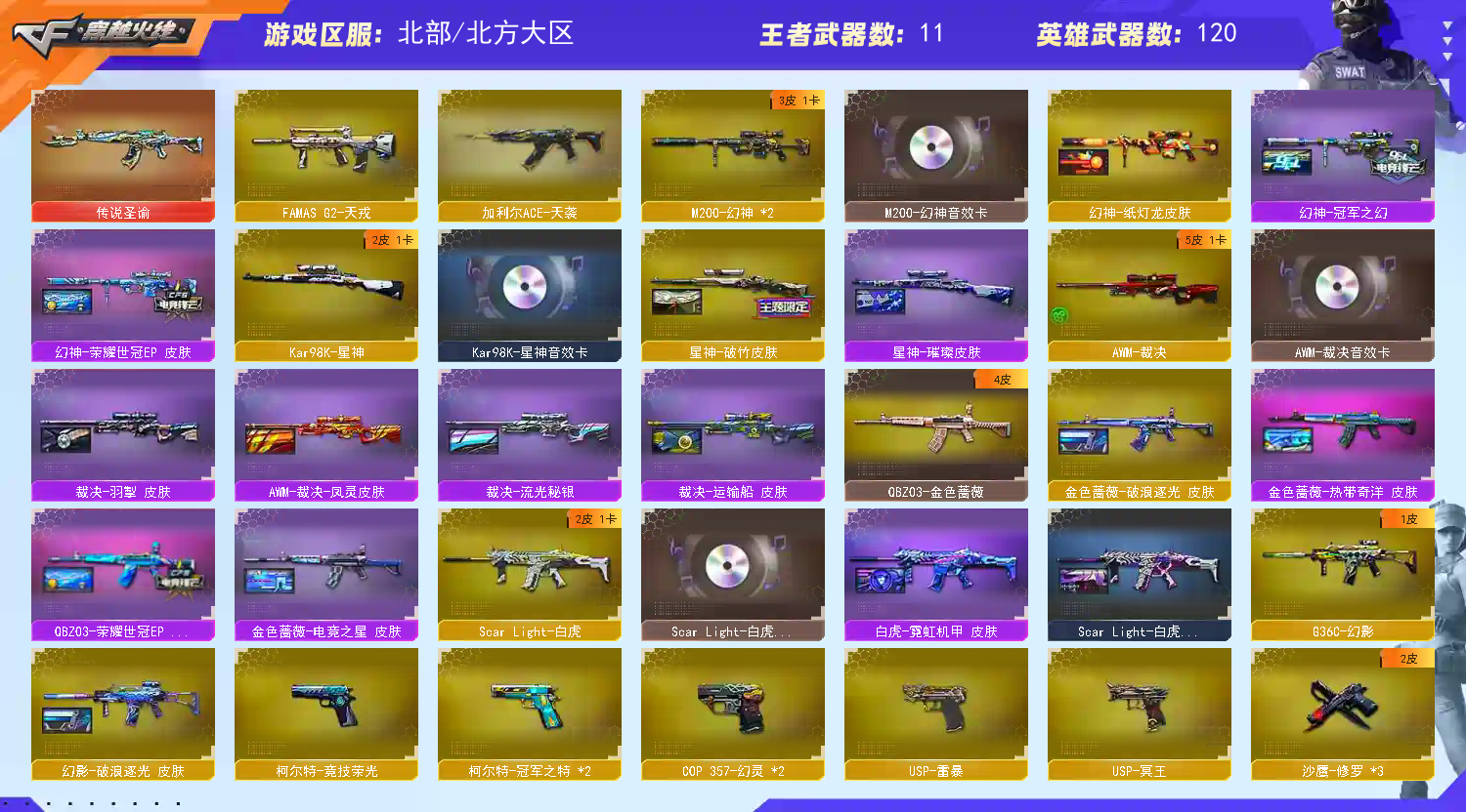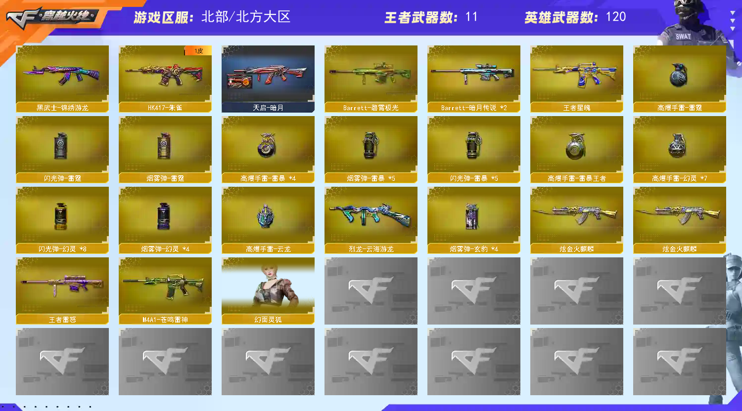 【稀有武器】:M200-幻神/Kar98K-星神/VSK-94-金蚀/G36C-幻影/ScarLight-白虎/HK417-朱雀/M4A1-幻灵/USP-雷暴/COP357-幻灵(2)/柯尔特-竞技荣光/修罗-云海游龙/修罗-古蛇迷踪/柯尔特-冠军之特(2)/金色蔷薇-古蛇迷踪/QBZ03-云龙/QBZ03-金色蔷薇/AK47-火麒麟/M4A1-黑龙/M4A1-雷神(2)/M4A1-黑骑士/Barrett-毁灭(2)/AWM-裁决/M200-竞技荣光/RPK-盘龙/加特林-炼狱(3)/AA-12-雷霆/炽芒蝶刃/斩神刀-雷暴/幻灵之锋