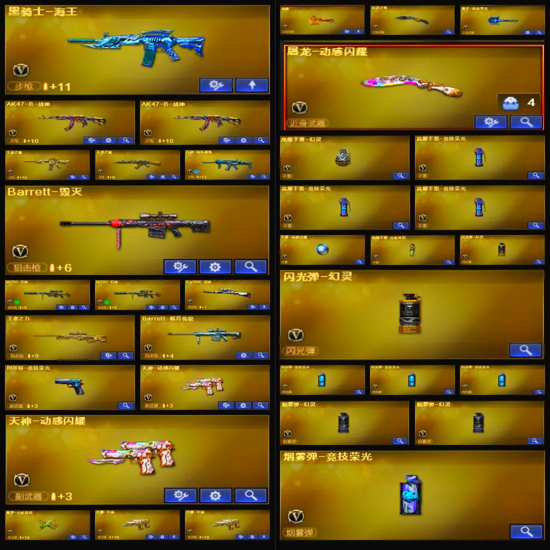 【英雄武器】_M200-幻神(2)/Barrett-毁灭/Barrett-暗月传说/Kar98K-星神/王者之力-觉醒版/M4A1-雷神/M4A1-黑骑士/黑骑士-海王/M4A1-玫瑰精灵/王者之魄-觉醒版/白虎-电玩蓝兔/AK12-天启/AK47-火麒麟(2)/无影-神兵利器/AK-47-猩红传说(7)/AK47-B-战神(2)/QBZ03-金色蔷薇(2)/王者之城-觉醒版/烈火-动感闪耀/9A91-烈火/天神-动感闪耀(2)/沙鹰-天神(2)/柯尔特-竞技荣光/龙啸/擎天-竞技荣光/屠龙-动感闪耀/幻灵之锋/手雷-动感闪耀/高爆手雷-幻灵/高爆手雷-竞技荣光(3)/烟雾弹-幻灵(2)/烟雾弹-竞技荣光/闪光弹-幻灵(2)/闪光弹-竞技荣光(3)/斯泰尔 AUG A3-雪夜奇缘/黑武士-锦绣游龙/机械迷城-穹宇/金色蔷薇-古蛇迷踪/修罗-古蛇迷踪/唐刀-古蛇迷踪/高爆手雷-古蛇迷踪/烟雾弹-古蛇迷踪