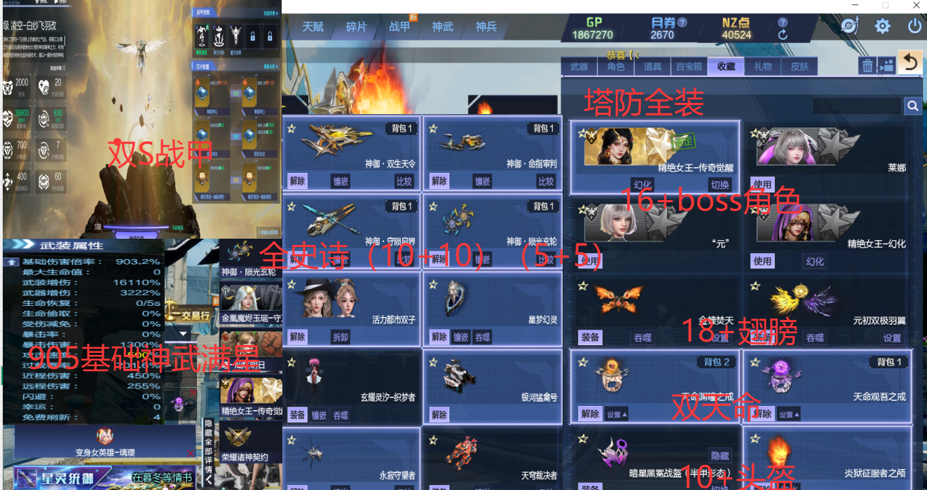 深渊武器30级、神武宝库绀蓝套、奥特曼五件套、塔防陷阱全能卡有很多天、百宝箱三级、泽塔装甲、裁决女帝-龙姬、