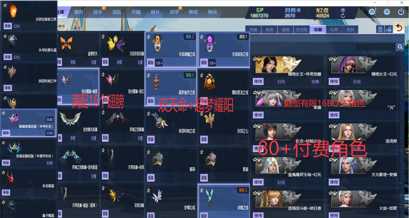 史诗套:幻域套僚机全皮肤(天权皮肤)(宠物逆元裂空兽)、六核神凰套(暗金皮肤)(宠物洛姬) 六核天帝套(群星皮肤)(宠物墨)、陨星套(糖心皮肤)、7天启套(波塞冬、流光、)(宠物库德里之驹)、四灵元素套、诸神套(宠物芙蕾雅)、魔鲲套(宠物鲲灵)、创世套、天神套、