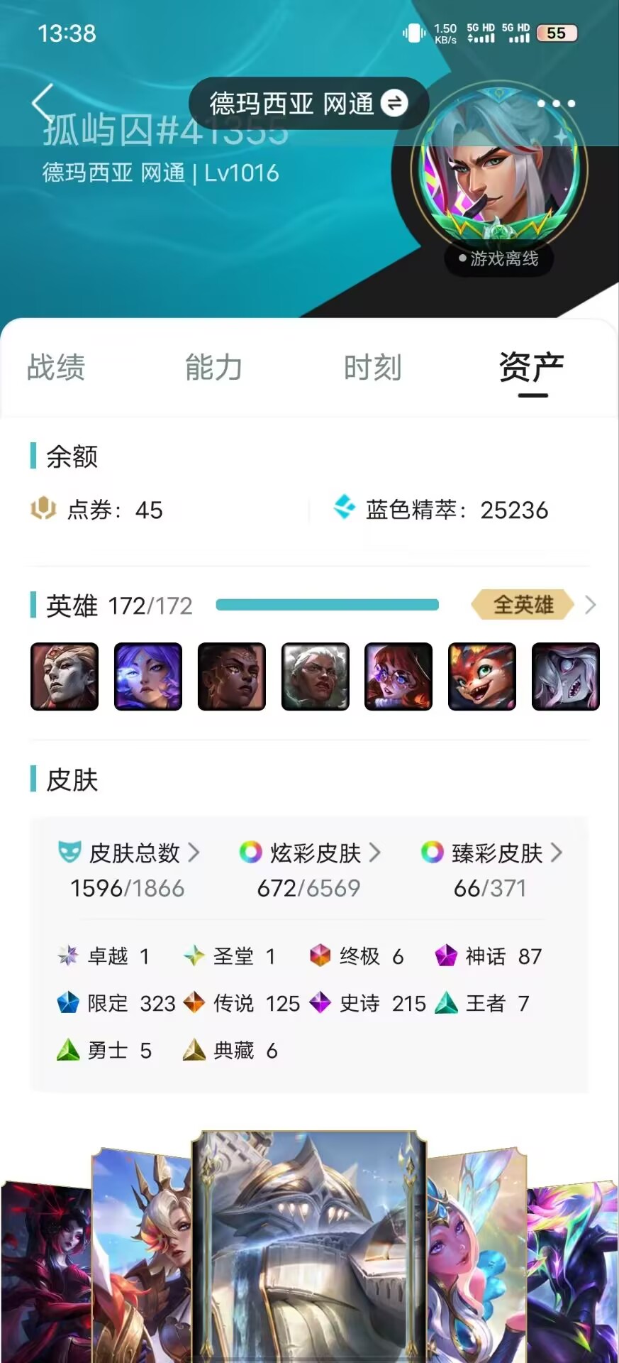 德玛西亚1600原皮❤可下棋可排位❤名人堂卡莎/1圣堂/6终极️/87神话/