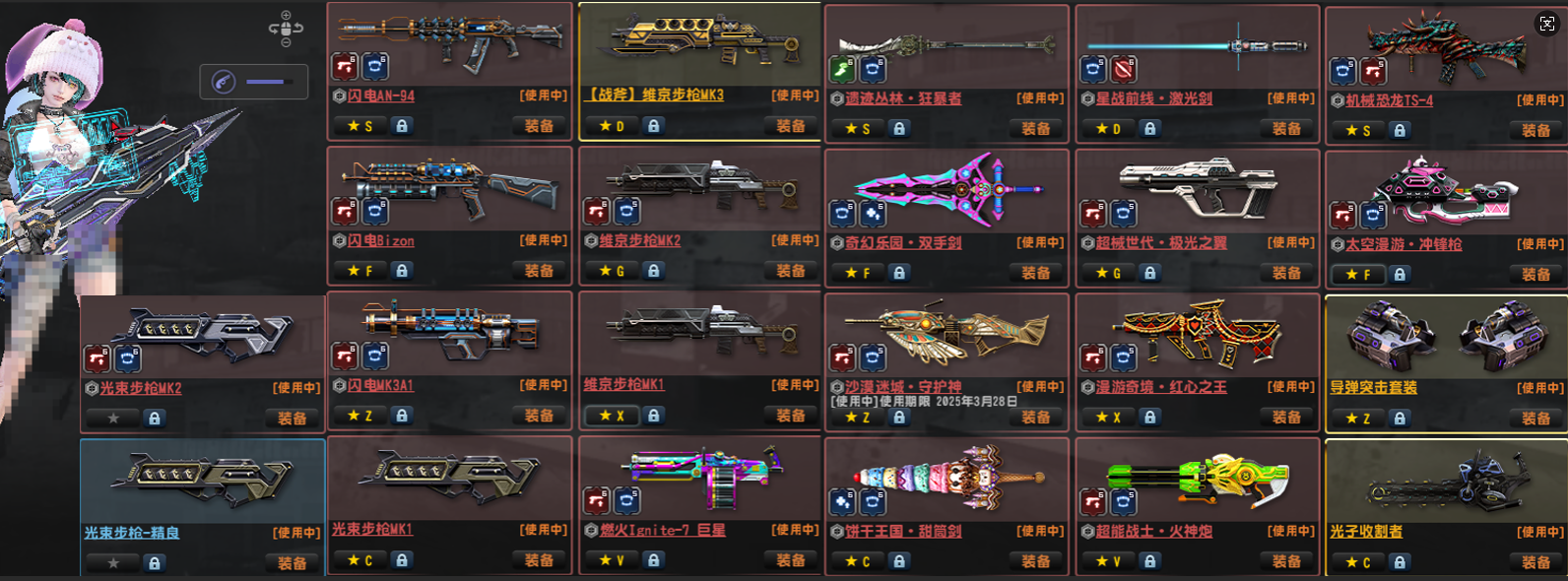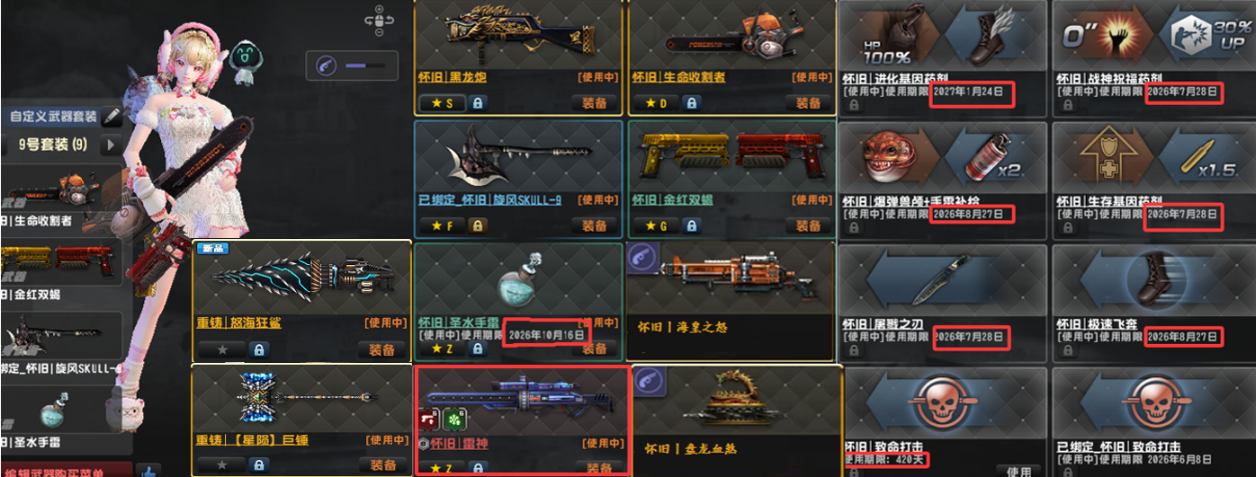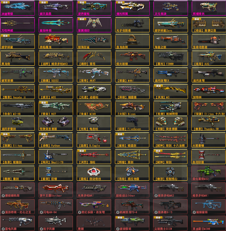 3.更新:天巡1,2,,怀旧三件套金红双蝎黑龙炮斧头!已去黑雾!赛季11到21赛季武器(第17赛季为期限);强化基本全满,配件武器最少5阶,少数6阶!