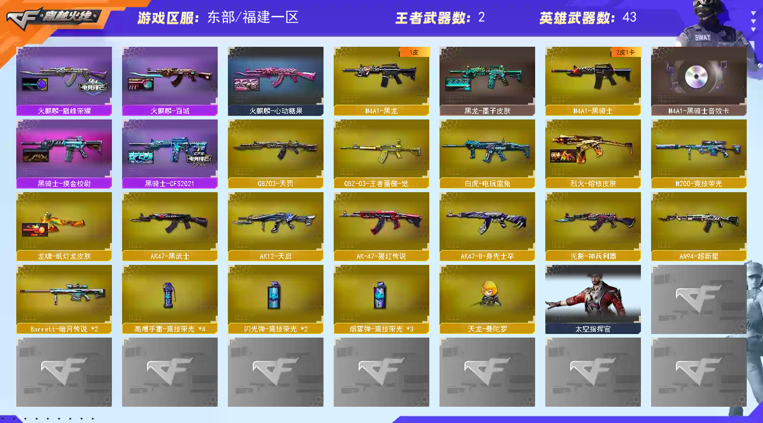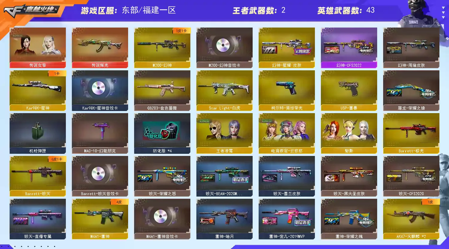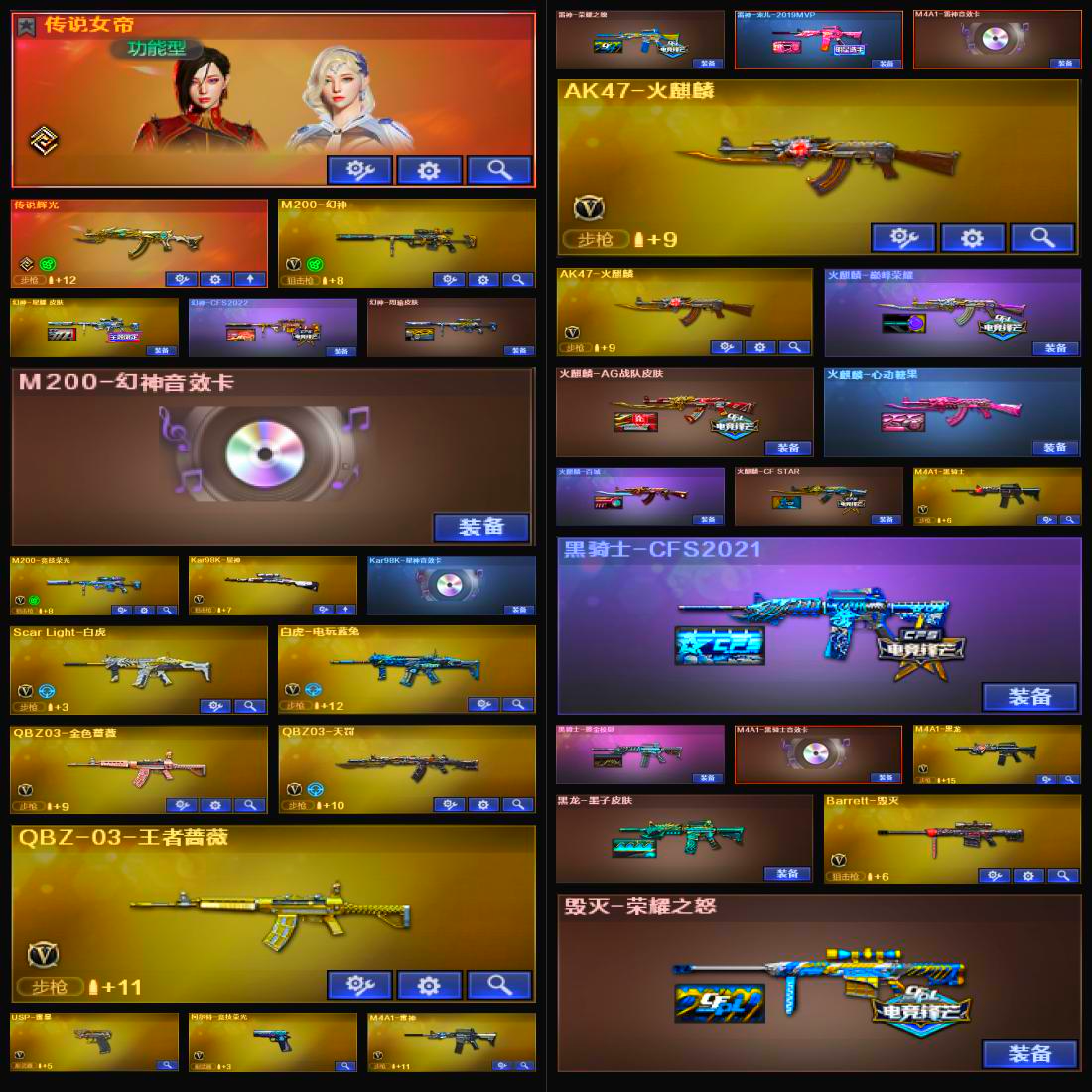 【可排位】【幻神三件套】【幻神3皮】【竞技荣光套装X4套】【传说女帝】【传说辉光】【M200-幻神】【幻神-星耀 皮肤】【幻神-CFS2022】【幻神-周瑜皮肤】【M200-幻神音效卡】【M200-竞技荣光】【Kar98K-星神】【Kar98K-星神音效卡】【Scar Light-白虎】【白虎-电玩蓝兔】【QBZ03-金色蔷薇】【QBZ03-天罚】【QBZ-03-王者蔷薇-觉醒版】【USP-雷暴】【柯尔特-竞技荣光】【魂·炼狱-玩具枪】【传说女帝】【电竞教官-云悠悠】【蛇隐宗】【王者凌霄】【魅影】【M4A1-雷神】【雷神-荣耀之魄】【雷神-宠儿-2019MVP】【M4A1-雷神音效卡】【AK47-火麒麟】【火麒麟-巅峰荣耀】【火麒麟-AG战队皮肤】【火麒麟-心动糖果】【火麒麟-百城】【火麒麟-CFSTAR】【M4A1-黑骑士】【黑骑士-CFS2021】【黑骑士-摸金校尉】【M4A1-黑骑士音效卡】【M4A1-黑龙】【黑龙-墨子皮肤】【Barrett-毁灭】【毁灭-荣耀之怒】【毁灭-BEAN-2020MVP】【毁灭-CFS2020】【毁灭-黑大圣皮肤】【Barrett-毁灭音效卡】