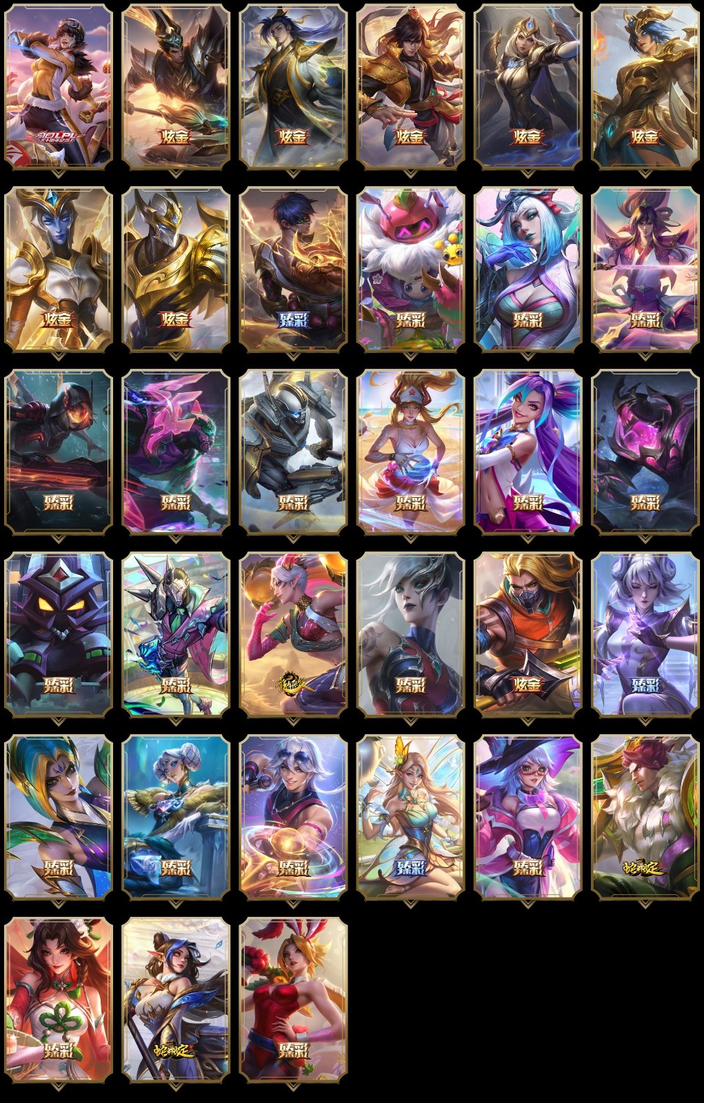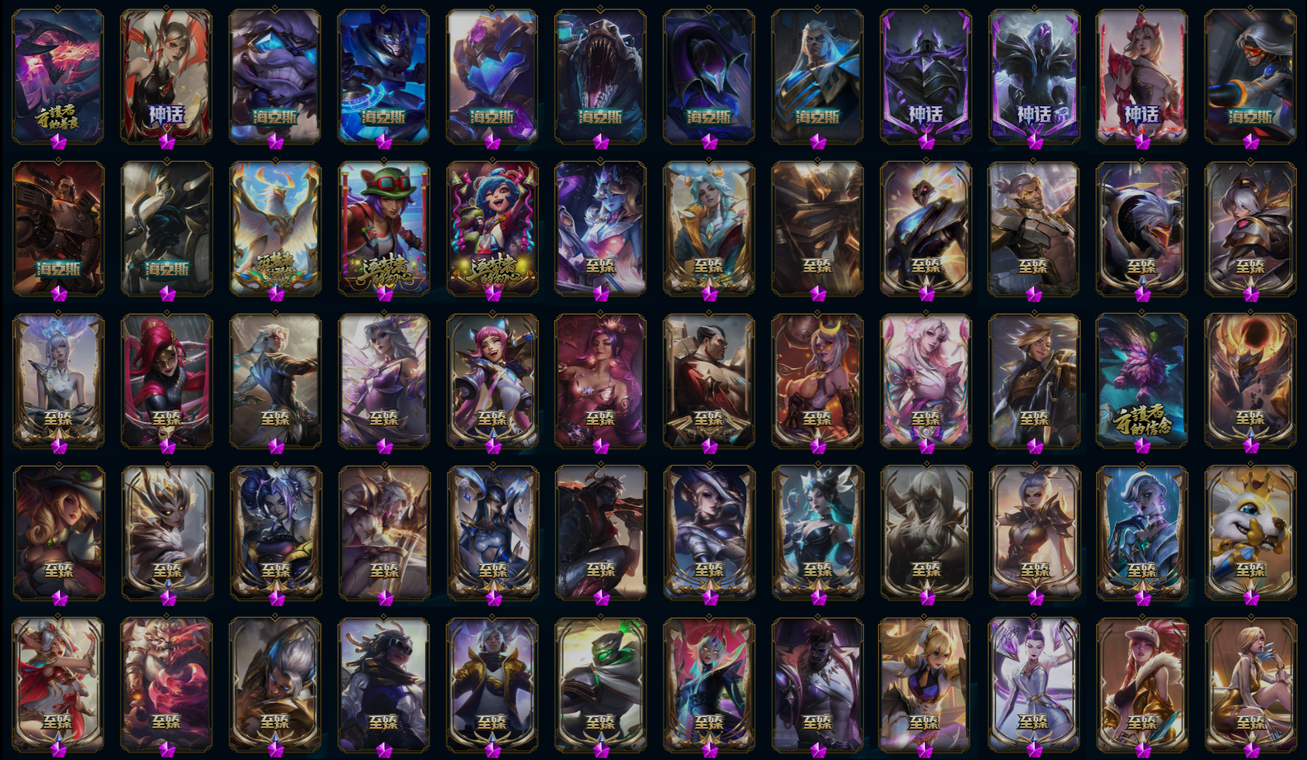 【传说皮肤】黯晶凤凰艾尼维亚 西部魔影大小姐蕾欧娜 星之守护者洛 魔女伊芙琳 欧米伽小队幽灵特工 心之钢凯隐 墨之影武者易 女帝卡特琳娜 源计划联合艾希 天煞劫 上古战魂魔腾 恶魔之刃泰达米尔 霸天零式赛恩 西部天使赛娜 死亡骑士盖伦 源计划林易 影执事劫 银河魔装机神兰博 灵魂莲华阿狸 星之守护者霞 源计划净化薇恩 灵能特工娑娜 黑夜使者亚索 神拳李青 绅士科加斯 宇航员诺提勒斯 星之守护者阿狸 神王德莱厄斯 神龙尊者昼日真龙亚索 奥德赛凯隐 苍穹之光韦鲁斯 驯龙学者黑默丁格 钢铁军团盖伦 烈焰雄心崔丝塔娜 铁哥们儿奥拉夫 血石领主弗拉基米尔 星之守护者卡莎 幻灵战斗队长厄运小姐 灌篮高手德莱厄斯 霸天异形卡兹克 星之守护者拉克丝 电玩女神娑娜 律政大亨蒙多 陆地王者4WD布里茨 灵魂莲华锤石 战斗学院伊泽瑞尔 黎明使者永恩 地狱行者孙悟空 真实伤害艾克 暗星锤石 枯萎之壤泽拉斯 钢铁之翼凯尔 大天使长米迦勒凯尔 战地巨兽科加斯 邪鸦魅影乐芙兰 约德尔国队长提莫 第三类接触黑默丁格 西部魔影卢锡安 地狱之门卫士加里奥 耀星女神拉克丝 提莫约德尔人的一大步 偶像歌手阿狸 源计划毁灭派克 未来战士凯特琳 焰尾妖狐阿狸 源计划超体莫德凯撒 符文战熊沃利贝尔 冰霜之刃艾瑞莉娅 女皇艾希 金牌主播德莱文 黎明使者锐雯 西部天使艾希 神王盖伦 冰川巨兽墨菲特 战斗学院凯特琳 光明哨兵薇恩 黯黑魔龙希瓦娜 红色男爵库奇 黎明使者索拉卡 合金巨兽努努和威朗普 驯龙炮手崔丝塔娜 光明哨兵格雷福斯 青花瓷伊泽瑞尔 恶魔男爵瑞兹 炼狱魔犬内瑟斯 女校长菲奥娜 暗星尊烬 双重冰晶艾尼维亚 西部魔影永恩 神龙尊者夜月幻龙亚索 源计划泯灭雷克顿 泳池派对吉格斯 神龙尊者圣龙李青 太空律动律动队长提莫 最终BOSS维迦