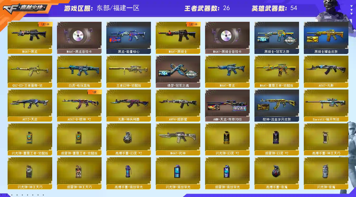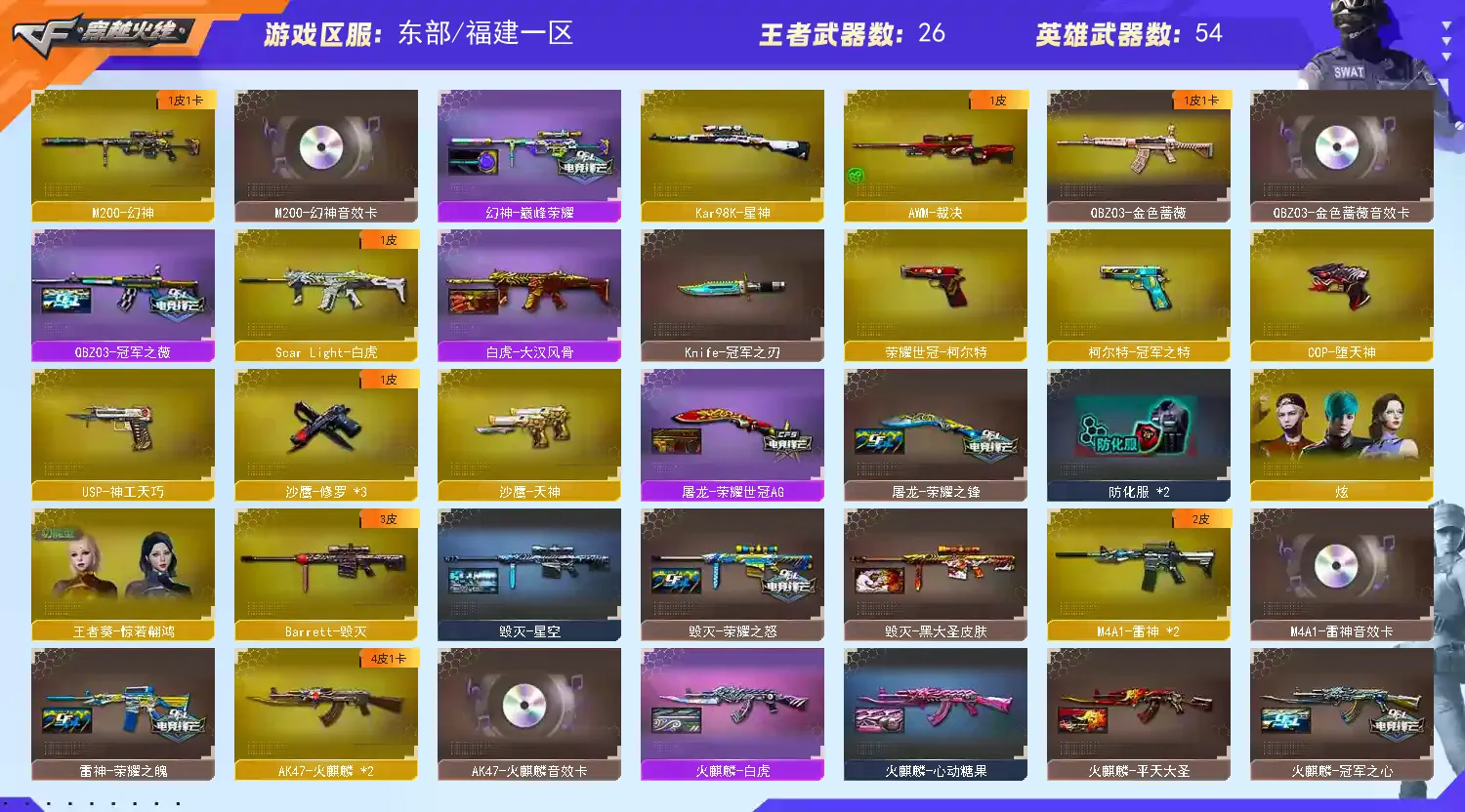 【福建一区】【V武器数54】【幻神三件套】【幻神1皮】【金色蔷薇三件套】【神工天巧套装X1套】【竞技荣光套装X1套】【夜魔套装X1套】【幻灵套装X2套】【M200-幻神】【幻神-巅峰荣耀】【M200-幻神音效卡】【王者幻神-觉醒版】【Kar98K-星神】【AWM-裁决】【Scar Light-白虎】【白虎-大汉风骨】【白虎-电玩粉兔皮肤】【白虎-电玩蓝兔】【QBZ03-金色蔷薇】【QBZ03-冠军之薇】【QBZ03-金色蔷薇音效卡】【QBZ-03-王者蔷薇-觉醒版】【M4A1-雷霆王者-觉醒版】【M4A1-青龙】【柯尔特-冠军之特】【荣耀世冠-柯尔特】【USP-神工天巧】【COP-堕天神】【Knife-冠军之刃】【M4A1-雷神】【雷神-荣耀之魄】【M4A1-雷神音效卡】【AK47-火麒麟】【火麒麟-白虎】【火麒麟-冠军之心】【火麒麟-平天大圣】【火麒麟-心动糖果】【火麒麟-CFSTAR】【AK47-火麒麟音效卡】【M4A1-黑骑士】【黑骑士-冠军之势】【黑骑士耀金皮肤】【M4A1-黑骑士音效卡】【M4A1-黑龙】【黑龙-能量核心】【M4A1-黑龙音效卡】【Barrett-毁灭】【毁灭-荣耀之怒】【毁灭-星空】【毁灭-黑大圣皮肤】