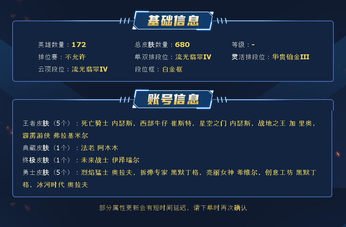 600皮黑色畅玩号,可排位可打字,稀有限定皮肤:斩星魔剑、龙刀龙嘴、花木兰、狗年狗头、披萨希维尔、鸡里奥、猴年美猴王、摄魂VN