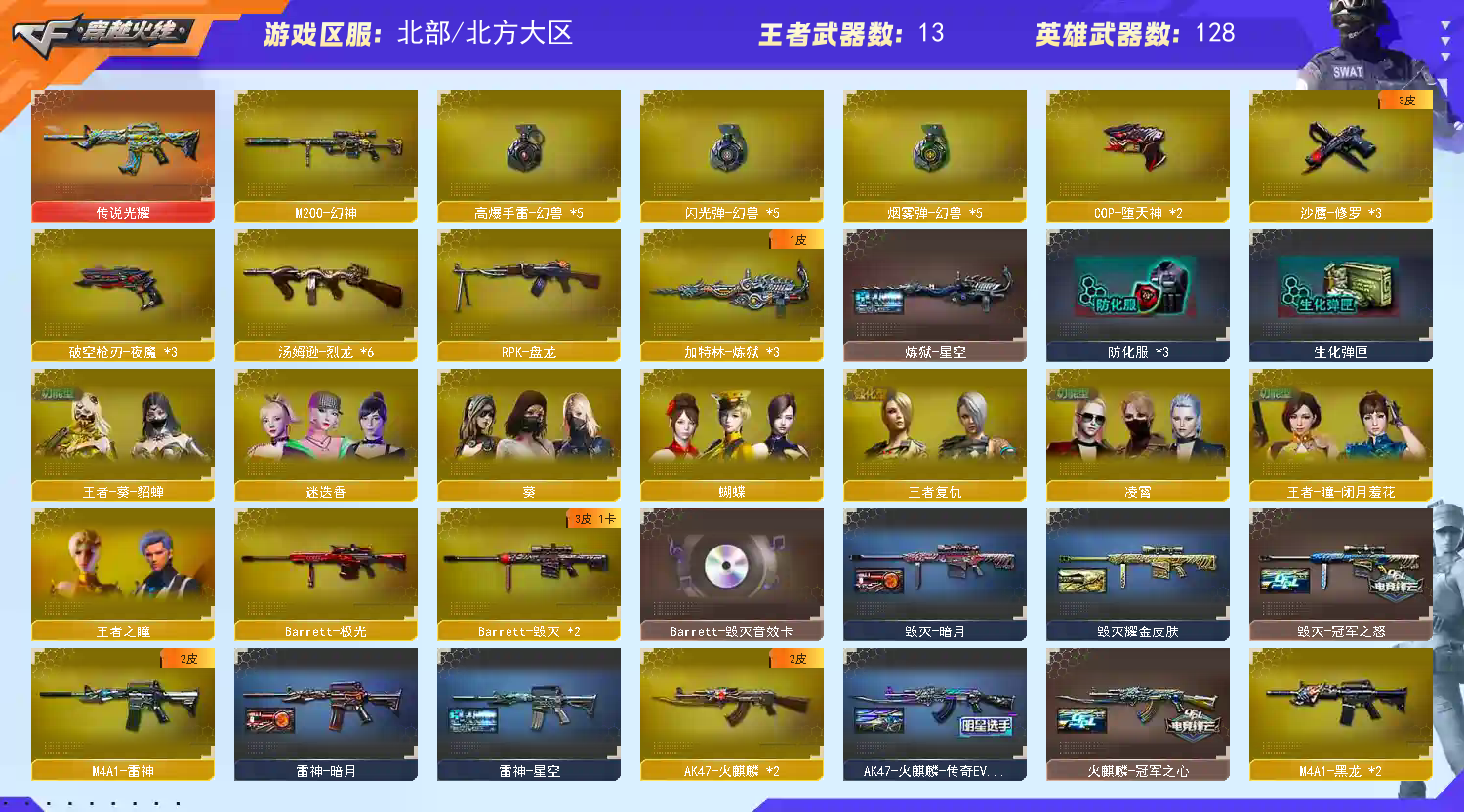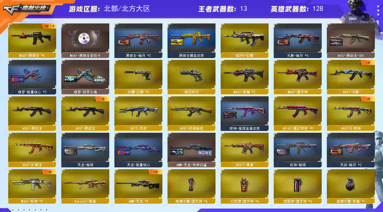 【其他重要武器】炫金骑士/火麒麟-能量核心/火麒麟-暗月(2)/黑武士-能量核心/黑骑士-摸金校尉/M4A1-十二生肖·龙-雷神/AK47-樱花/AK-12-CFS2017纪念版(2)/9A91-2017万圣节/雷神-赛博朋克/黄金AK-47/M4A1-秘银赤龙(3)/AK47-SS-9周年/AK47-轮回/海浪AK47-Q浏览器/M4A1-狂欢-CFS/AK47-B-十周年/AK47-狂欢-CFS/M4A1-十年火线/AWM-圣诞/FN弩炮-CFS2017纪念版/凤凰之力(2)/Barrett-翔龙/AWM-T/AWM-恶棍-枪王排位/AWM-A-圣诞2021/AWM-A/98K-蓝色骑士/M200-涂鸦/暗金M200/M200-赤血龙魂(4)/MG3-翔龙/斯泰尔-巧克力/斯泰尔-CFS2017纪念版(2)/Spas-12-黑金/SPAS-12-雷电核心/COP357-十二生肖·羊/愤怒公牛左轮-枪王排位/新USP-枪王排位奖励/柯尔特-百城/COP 357-青龙/鹰爪-枪王排位/尼泊尔-炎龙/蝴蝶刀-枪王排位/收割者-枪王排位/丛林匕首-卧龙(4)/唐刀-九五至尊/红色诅咒娃娃手雷/闪光弹-枪王排位/胜利奖杯烟雾弹-枪王排位