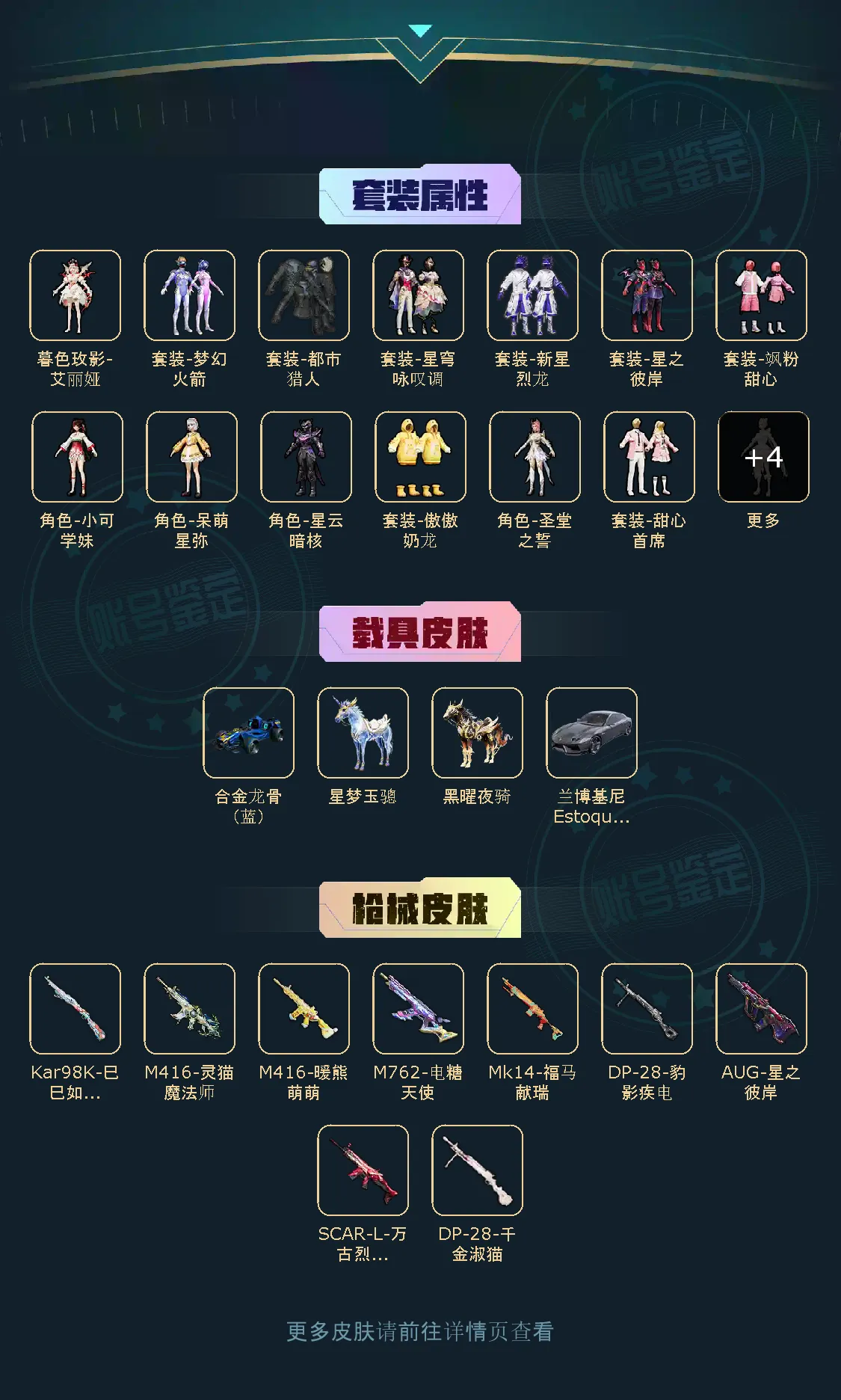 【稀有资产】暮色玫影-艾丽娅[2级]/角色-千金淑猫/M416-暖熊萌萌/M416-灵猫魔法师/SCAR-L-万古烈焰/AUG-星之彼岸/角色-Mark.06/套装-都市猎人/套装-奇异狩猎者/套装-浪漫天命/套装-暗影哥特/套装-龟仙人/套装-迅捷狂鲨/套装-浪漫假日/角色-都市丽猫/角色-摩登魅猫/角色-灵公主/角色-鲛海歌灵/大砍刀-青龙偃月刀
