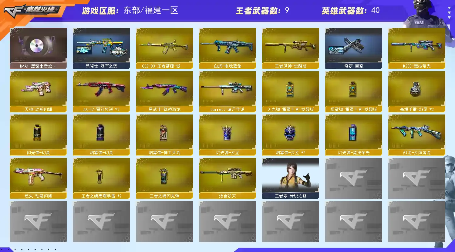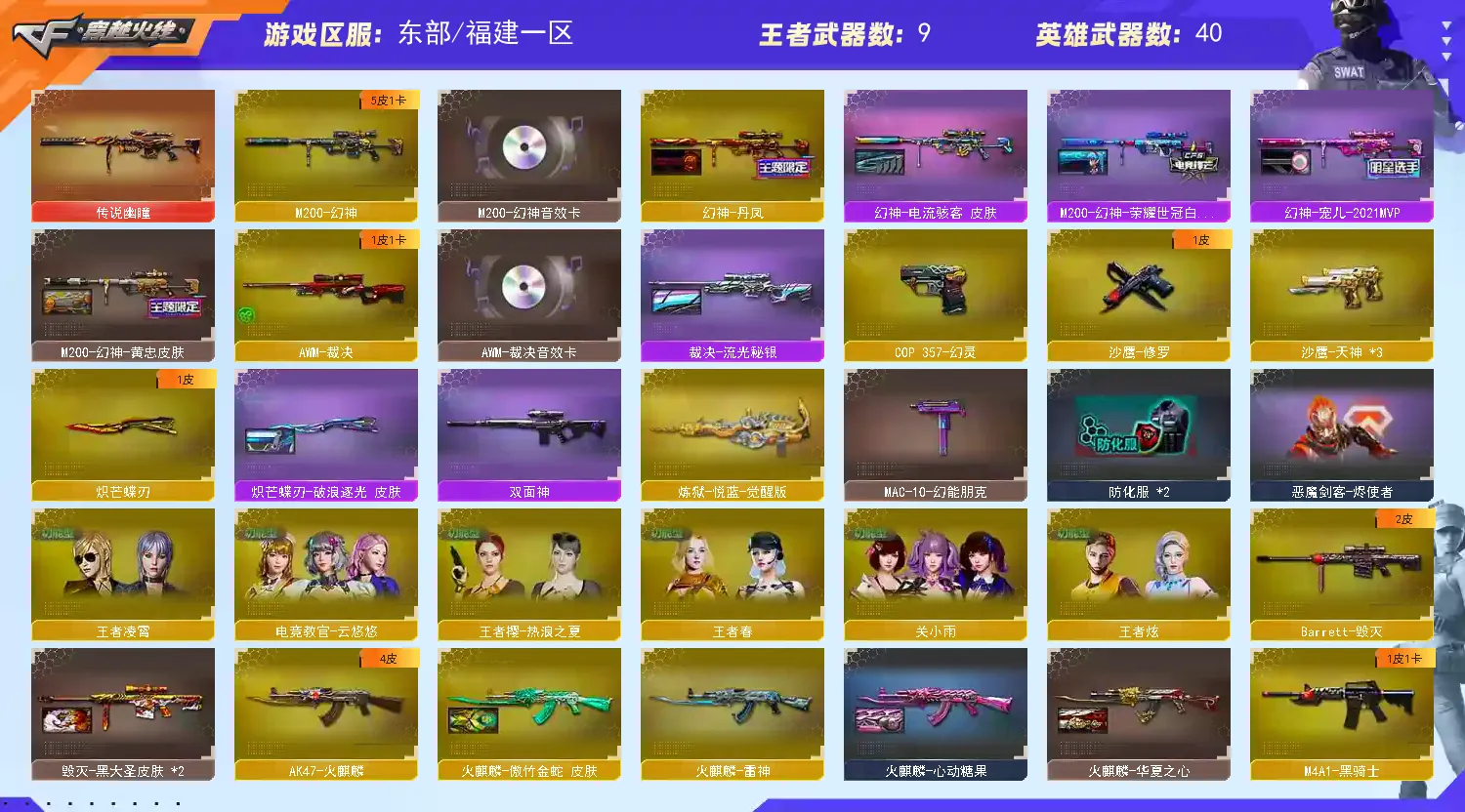 【传说幽瞳】【M200-幻神+音效卡+幻神-丹凤+幻神-宠儿+幻神-荣耀世冠白鲨+幻神-黄忠】【竞技荣光套】【王者风神】【M200-幻神】【竞技荣光套】【裁决+音效卡】【Barrett-毁灭】【AK47-火麒麟】【黑骑士+音效卡+黑骑士-冠军之势】【7手枪 修罗 天神*3 cop幻灵】【5近战 炽芒蝶刃蝴蝶刀】【手雷 幻灵雷】【四防 王者春 王者凌霄 王者炫】