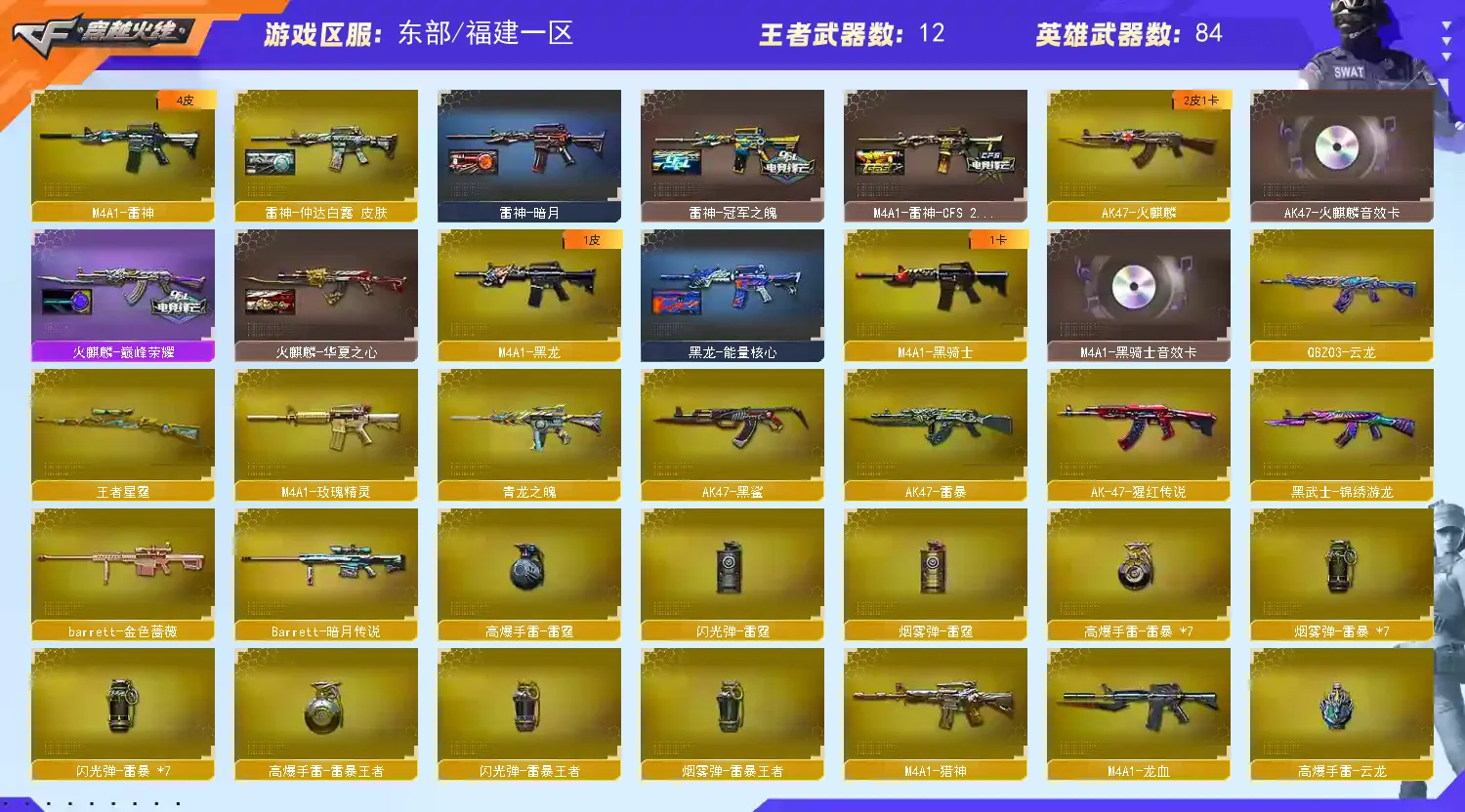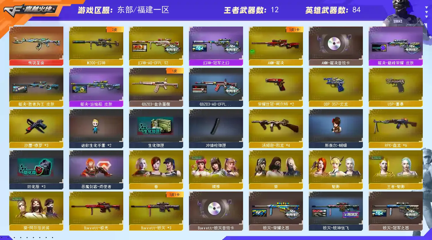 【m200幻神+ag24冠军+冠军之幻+usp雷暴】【王者星霆】【6盘龙 烈龙*4 斯太尔蝴蝶 】【传说圣谕】【qbz金色蔷薇+ag19冠军】【火麒麟+卡+巅峰荣耀】【黑龙】【雷神+冠军之魄】【黑骑士+卡】【毁灭+卡+冠军之怒+荣耀之怒】【极光】【裁决+裁决音效卡 +巅峰荣耀】【雷暴套 云龙套】【武器:雷暴 云龙 朱雀 王者火魄 】【7手枪:修罗*3 雷暴 云龙 荣耀世冠柯尔特*2】【12刀具:屠龙*3 龙啸 擎天 麒麟刺*4 尼泊尔雷霆 斩神刀雷暴 云龙扇 龙啸 】【8雷套:雷霆雷 雷暴雷*7】【音效卡:裁决音效卡 毁灭音效卡 火麒麟音效卡 黑骑士音效卡 】【四防角色:王者魅影 职业经理 】