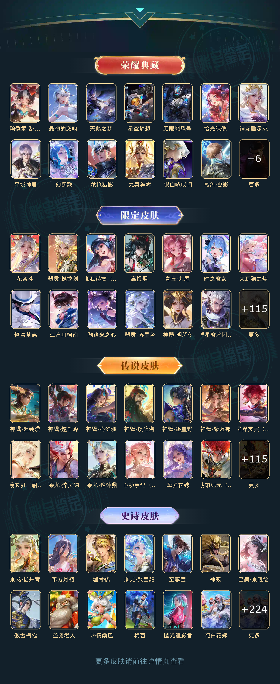 贵族等级V10无双贵族,英雄数量129,典藏皮肤数19,皮肤数量740,冰锋战神/街头霸王/天鹅之梦/纯白花嫁/天魔缭乱/至尊宝/杀手不太冷/真爱至上/圣诞老人/王者之锤/大秦宣太后/凤求凰/热情桑巴/逐梦之影/武陵仙君/神奇女侠/星空梦想/梅西/无限飓风号/黄金狮子座/一生所爱/全息碎影/大圣娶亲/冰霜恋舞曲/青龙志/白虎志/朱雀志/活力突击/太华/久胜战神/飞衡/梁祝/倪克斯神谕/白鹤梁神女/匿光追影者/鸣剑·曳影/遇见胡旋/龙胆/星域神启/李逍遥/武圣/奔雷神使/孙行者/玉兔公主/补天/异界灵契/神威/启示之音/傲雪梅枪/淬星耀世/时雨天司