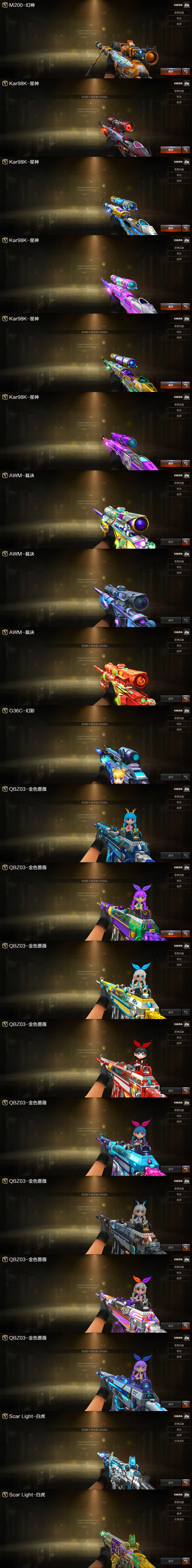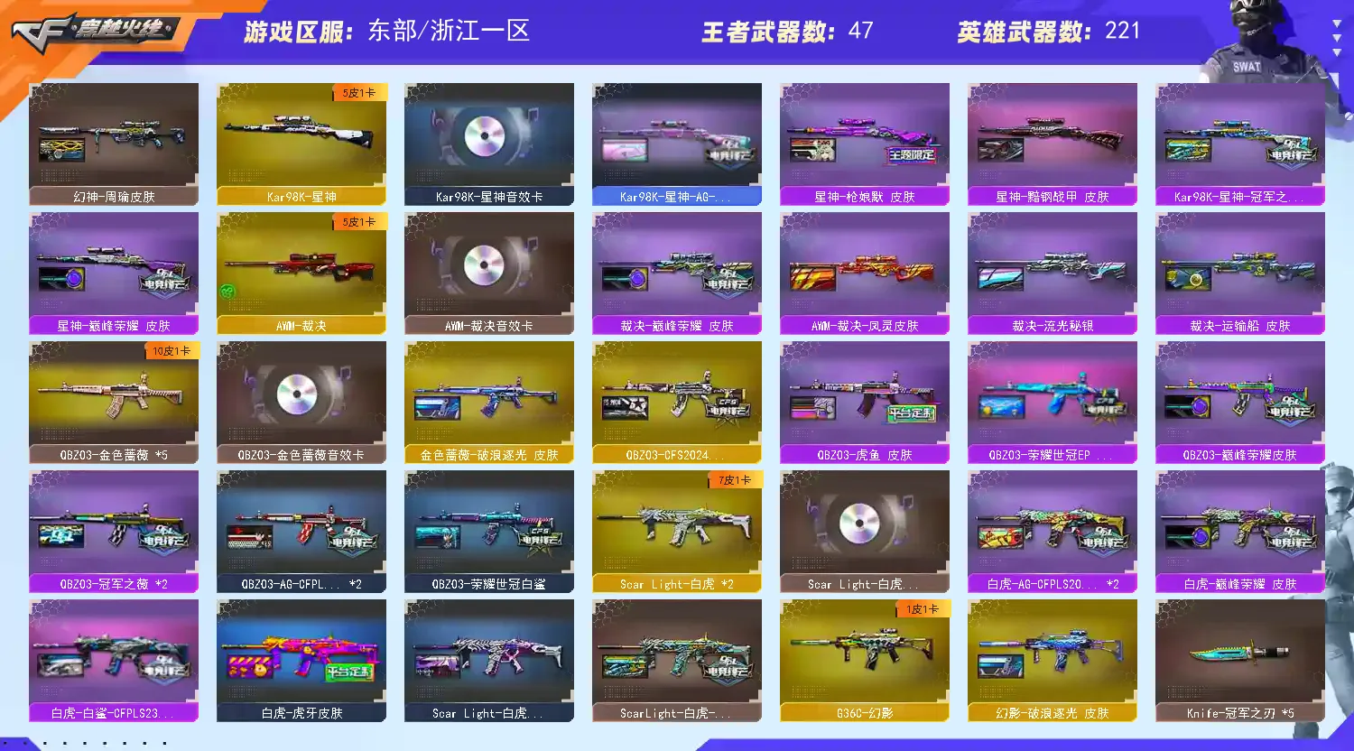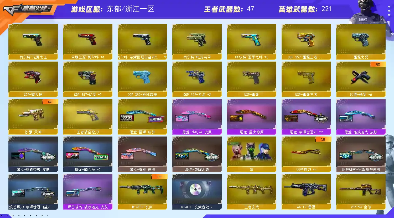 【稀有武器】:传说夜影/传说灵眸/传说幽瞳/传说破晓/传说幽冥/M200-幻神(4)/Kar98K-星神/VSK-94-金蚀/G36C-幻影/ScarLight-白虎(2)/M14EBR-玄武/M4A1-青龙/HK417-朱雀/QBZ03-天罚/AK47-雷暴/雷霆之契/USP-雷暴/COP-堕天神/柯尔特-电竞装甲/COP357-幻灵(2)/天神-动感闪耀/COP357-云龙(2)/柯尔特-荣耀世冠白鲨2023(2)/柯尔特-无冕之王/修罗-古蛇迷踪/荣耀世冠-柯尔特(4)/COP357-雷霆王者-觉醒版/柯尔特-冠军之特(5)/王者破空枪刃/金色蔷薇-古蛇迷踪/QBZ03-云龙/QBZ03-金色蔷薇(5)/AK47-火麒麟(5)/M4A1-黑龙(3)/M4A1-雷神(8)/M4A1-黑骑士(7)/AK47-无影/AK47-黑武士/荣耀世冠-火麒麟/荣耀世冠-雷神/Barrett-毁灭(3)/Barrett-极光/AWM-裁决/M200-竞技荣光/RPK-盘龙/加特林-炼狱(5)/汤姆逊-烈龙(6)/AA-12-雷霆/炽芒蝶刃(2)/斩神刀-雷暴/幻灵之锋/擎天-竞技荣光/云龙扇