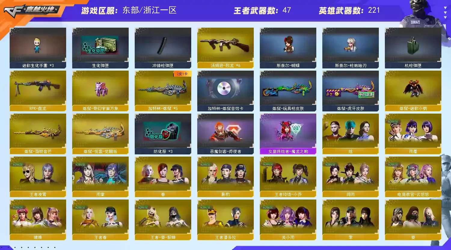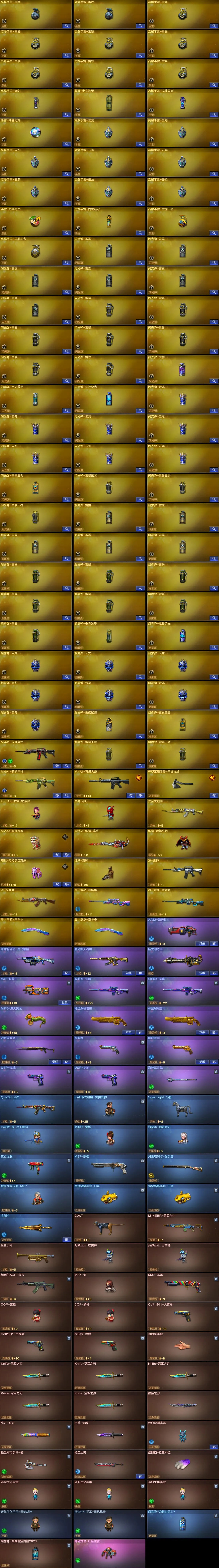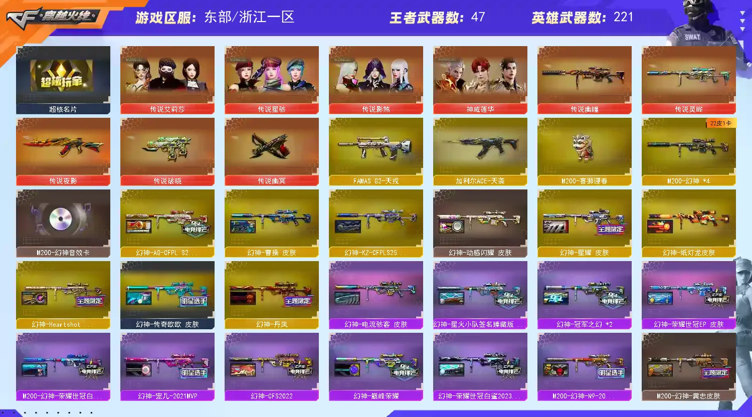 【稀有武器】:传说夜影/传说灵眸/传说幽瞳/传说破晓/传说幽冥/M200-幻神(4)/Kar98K-星神/VSK-94-金蚀/G36C-幻影/ScarLight-白虎(2)/M14EBR-玄武/M4A1-青龙/HK417-朱雀/QBZ03-天罚/AK47-雷暴/雷霆之契/USP-雷暴/COP-堕天神/柯尔特-电竞装甲/COP357-幻灵(2)/天神-动感闪耀/COP357-云龙(2)/柯尔特-荣耀世冠白鲨2023(2)/柯尔特-无冕之王/修罗-古蛇迷踪/荣耀世冠-柯尔特(4)/COP357-雷霆王者-觉醒版/柯尔特-冠军之特(5)/王者破空枪刃/金色蔷薇-古蛇迷踪/QBZ03-云龙/QBZ03-金色蔷薇(5)/AK47-火麒麟(5)/M4A1-黑龙(3)/M4A1-雷神(8)/M4A1-黑骑士(7)/AK47-无影/AK47-黑武士/荣耀世冠-火麒麟/荣耀世冠-雷神/Barrett-毁灭(3)/Barrett-极光/AWM-裁决/M200-竞技荣光/RPK-盘龙/加特林-炼狱(5)/汤姆逊-烈龙(6)/AA-12-雷霆/炽芒蝶刃(2)/斩神刀-雷暴/幻灵之锋/擎天-竞技荣光/云龙扇