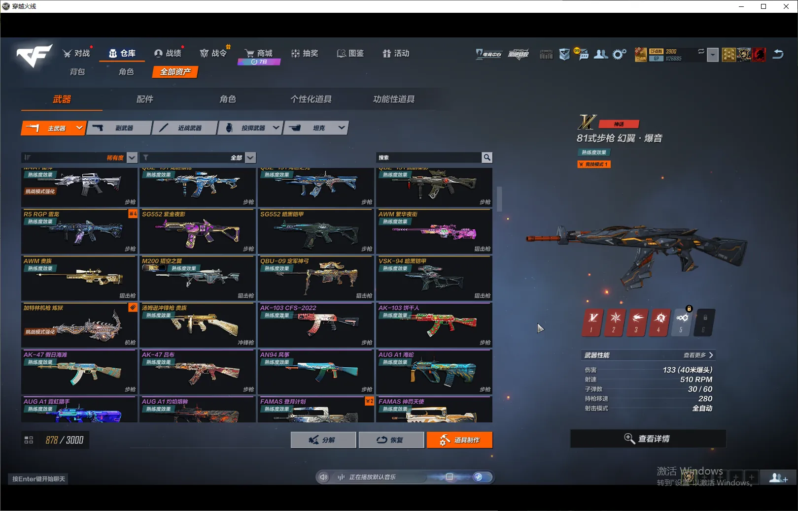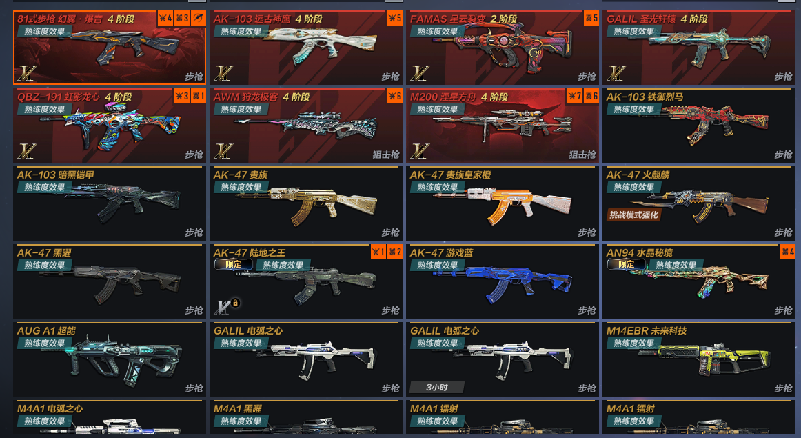 主武:FAMAS星云裂变,81式步枪幻翼·爆音4阶段 AK103远古神鹰4阶段 GALIL圣光轩辕4阶段 QBZ191虹影龙心 AWM狩龙极客4阶段 M200湮星方舟4阶段 AK103暗黑铠甲 AK47贵族 AK47贵族皇家橙 AK47火麒麟 AK47陆地之王 AUGA1超能 GALIL电弧之心 M14EBR未来科技 M4A1电弧之心 M4A1镭射 M4A1雷神 QBZ191龙胆银枪 QBZ191湾区之光 QBZ191武韵秦影 R5RGP雷龙 SG552紫金夜影 SG552暗黑铠甲 AWM繁华夜街 AWM贵族 M200猎空之翼 QBU09定军神弓 VSK94暗黑铠甲 加特林炼狱 汤姆逊冲锋枪贵族 AN94水晶秘境