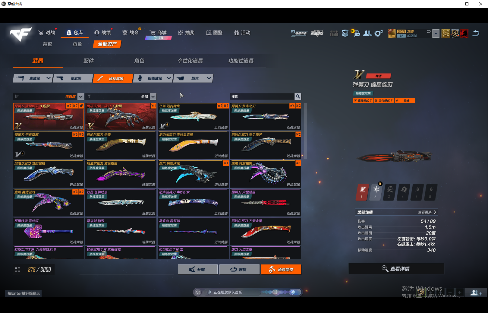 近战:弹簧刀摘星疾刃1阶段 鹰爪幻翼旋刃1阶段 匕首远古神鹰 弹簧刀炫光之刃 蝴蝶刀干将莫邪 尼泊尔军刀贵族 尼泊尔军刀贵族皇家橙 尼泊尔军刀竞见锋芒 尼泊尔军刀龙胆银枪 尼泊尔军刀紫金夜影 鹰爪寒霜冰龙 鹰爪狩龙极客 鹰爪赛博派对