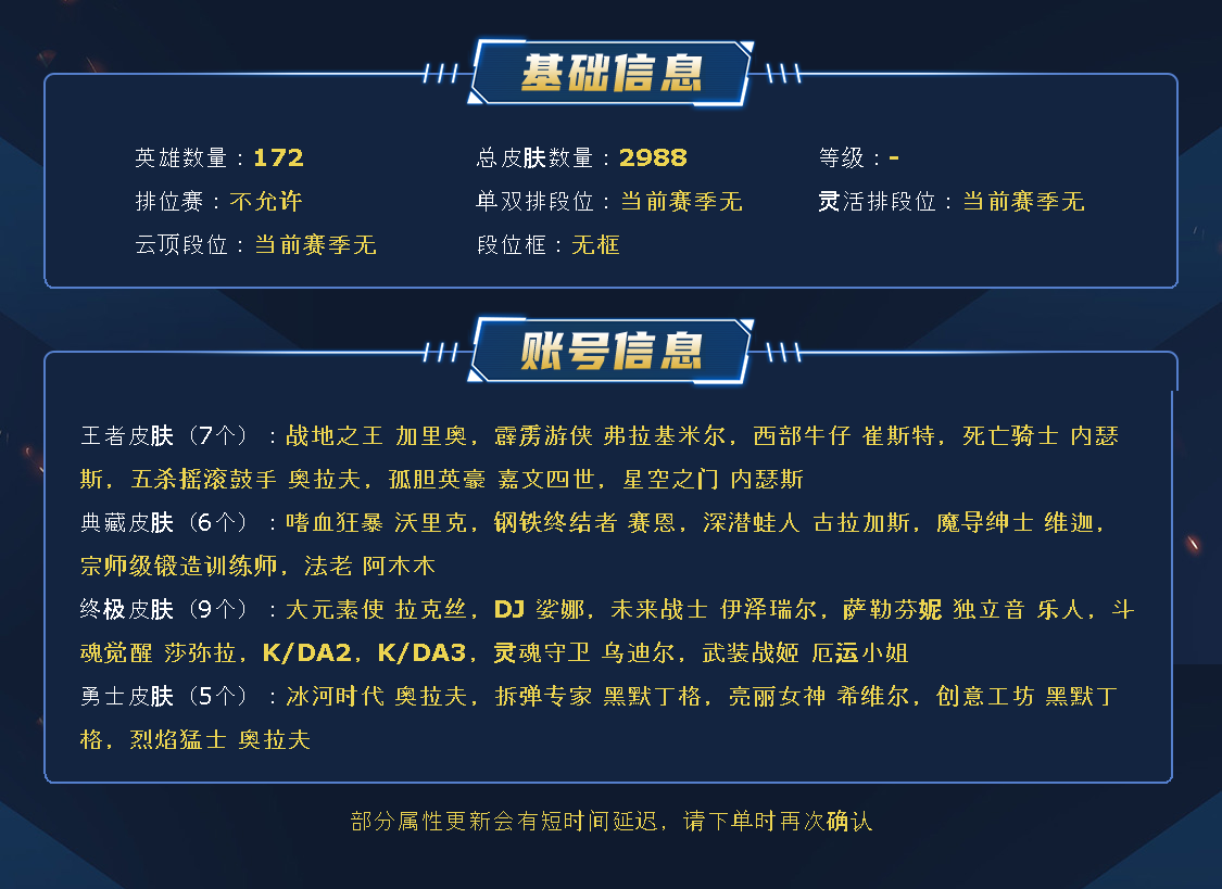 艾欧尼亚2900皮丨1625原皮丨1360炫彩丨351限定丨115神话丨55臻彩丨7终极