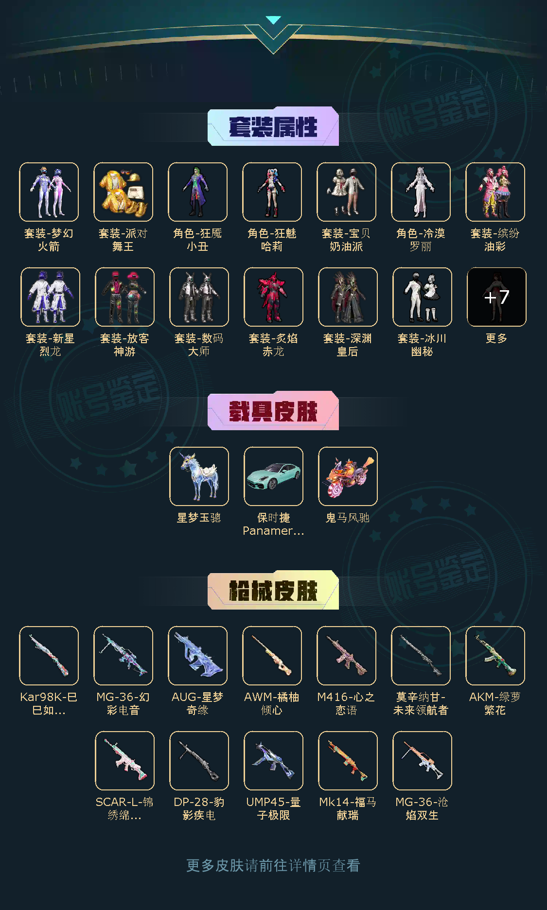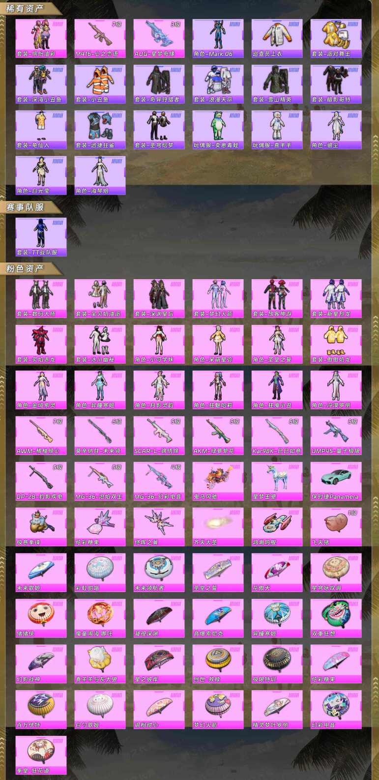 【稀有资产】套装-缤纷油彩/M416-心之恋语/AUG-星梦奇缘/角色-Mark.06/巡查员上衣/套装-派对舞王/套装-深海小丑鱼/套装-小丑鱼/套装-奇异狩猎者/套装-浪漫天命/套装-雪山精英/套装-暗影哥特/套装-龟仙人/套装-迅捷狂鲨/套装-圣穹绘梦/玩偶服-卖崽青蛙/玩偶服-喜羊羊/角色-银尘/角色-白光莹/角色-海琴烟