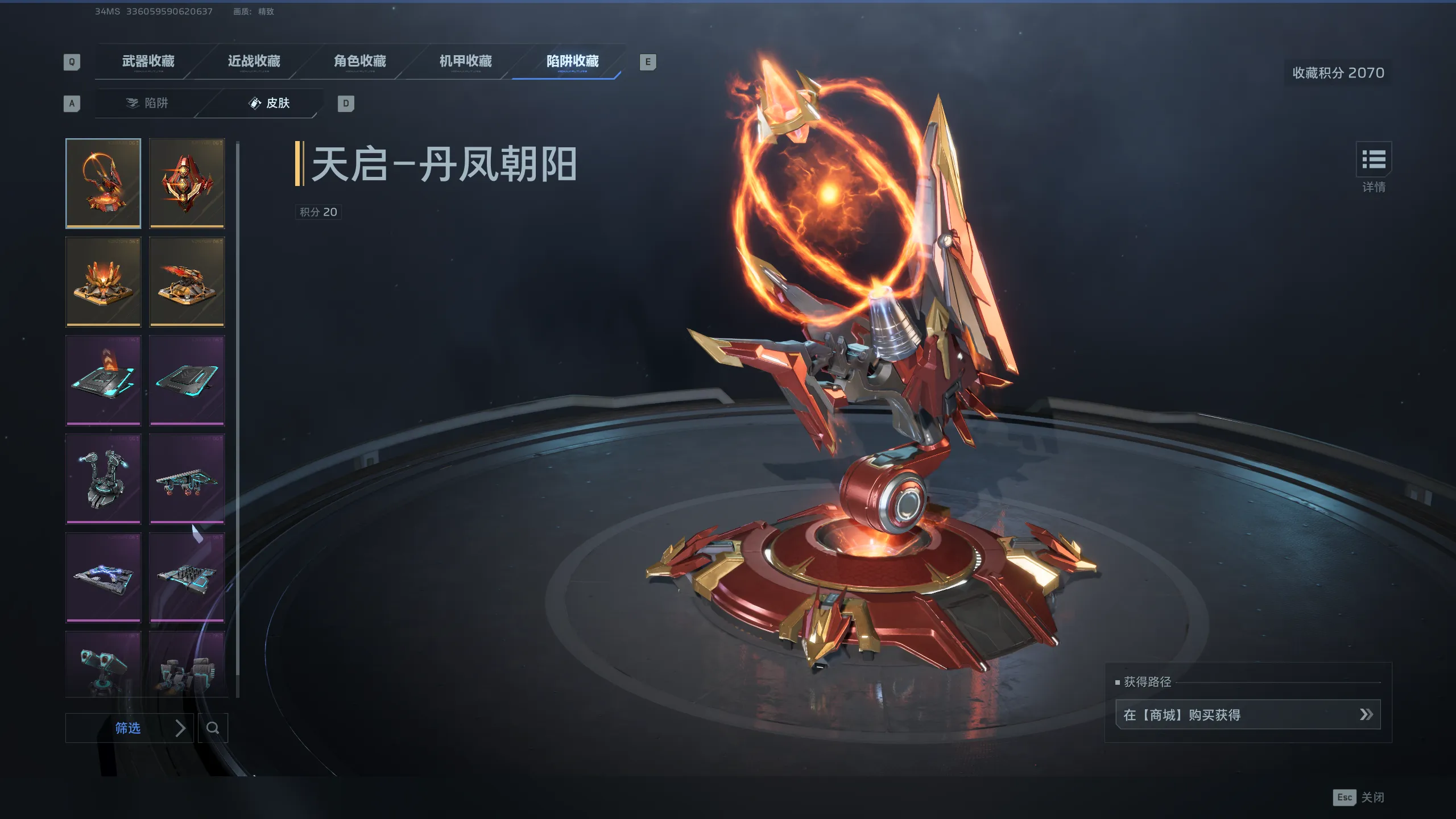 【陷阱皮肤】天启-丹凤朝阳、天网-丹凤朝阳、自修复磁暴塔-红莲业、破坏者-红莲业火、巨型弹板-脉冲星核、小型弹板-脉冲星核、修理站-脉冲星核、高能激光-脉冲星核、减速陷阱-脉冲星核、突刺陷阱-脉冲星核、防空导弹-脉冲星核、火焰发射器-脉冲星核