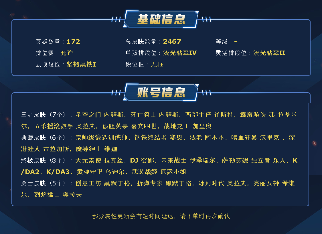艾欧尼亚2400皮丨1545原皮丨922炫彩丨294限定丨60神话丨41臻彩