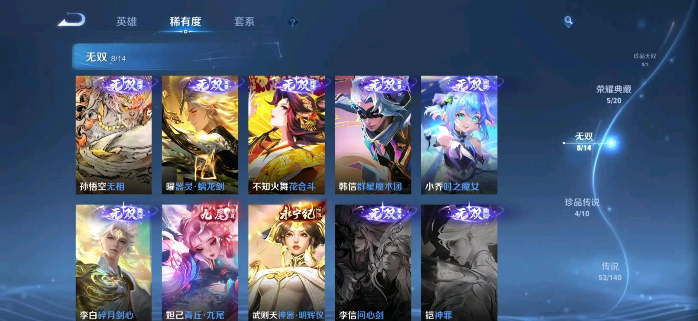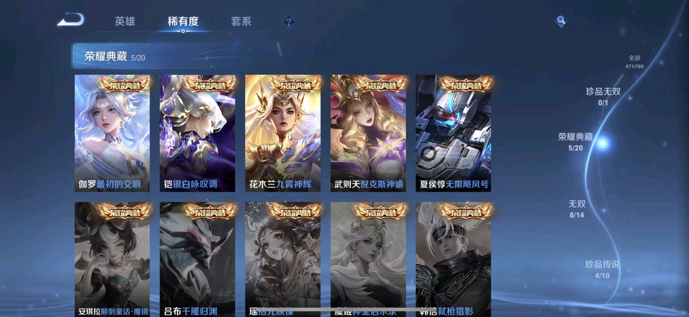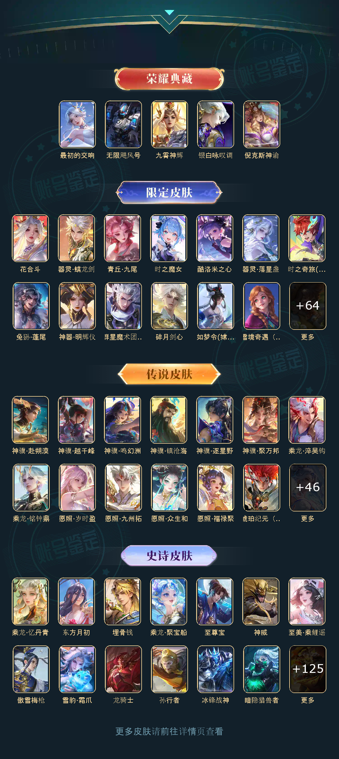 贵族等级V10,段位至尊星耀,英雄数量129,典藏皮肤数5,皮肤数量478,天魔缭乱/至尊宝/无限飓风号/白虎志/无相/器灵·螭龙剑/愿照·九州拓/愿照·众生和/冥王哈迪斯/神器·明辉仪/乘龙·问璇玑/群星魔术团(韩信)/落雪白狼/愿照·福禄聚/无双飞将/遇见神鼓/李逍遥/默契交锋(花木兰)/花合斗/神骥·赴朔漠/霜北刀/器灵·落星盏/琥珀纪元(马超)/神骥·鸣幻洲/至美·乘鲤谣/时之奇旅(孙策)/碎月剑心/愿照·千秋盛/乘龙·淬吴钩/东方月初/零号·赤焰/乘龙·铭钟鼎/埋骨钱/最初的交响/黄金天蝎座/兔狲·蓬尾/神骥·镇沧海/愿照·岁时盈/乘龙·聚宝船/问心剑/神威/启示之音/乘龙·忆丹青/九霄神辉/神树通天/青丘·九尾/银白咏叹调/愿照·山河定/酷洛米之心/时之魔女/傲雪梅枪/雪豹·霜爪/天魔缭乱/至尊宝/无限飓风号/白虎志/无相/器灵·螭龙剑/愿照·九州拓/愿照·众生和/冥王哈迪斯/神器·明辉仪/乘龙·问璇玑/群星魔术团(韩信)/落雪白狼/愿照·福禄聚/无双飞将/遇见神鼓/李逍遥/默契交锋(花木兰)/花合斗/神骥·赴朔漠/霜北刀/器灵·落星盏/琥珀纪元(马超)/神骥·鸣幻洲/至美·乘鲤谣/时之奇旅(孙策)/碎月剑心/愿照·千秋盛/乘龙·淬吴钩/东方月初/零号·赤焰/乘龙·铭钟鼎/埋骨钱/最初的交响/黄金天蝎座/兔狲·蓬尾/神骥·镇沧海/愿照·岁时盈/乘龙·聚宝船/问心剑/神威/启示之音/乘龙·忆丹青/九霄神辉/神树通天/青丘·九尾/银白咏叹调/愿照·山河定/酷洛米之心/时之魔女/傲雪梅枪/雪豹·霜爪