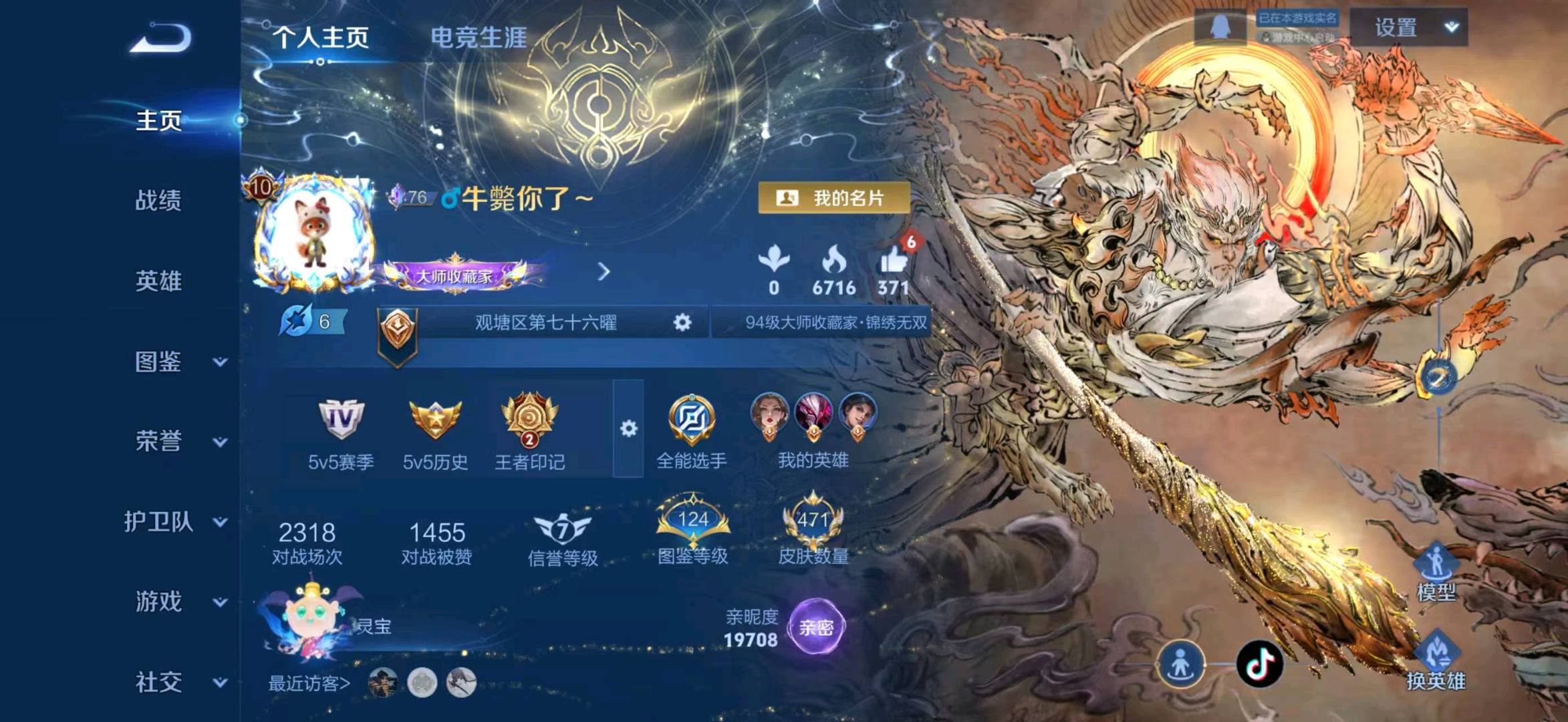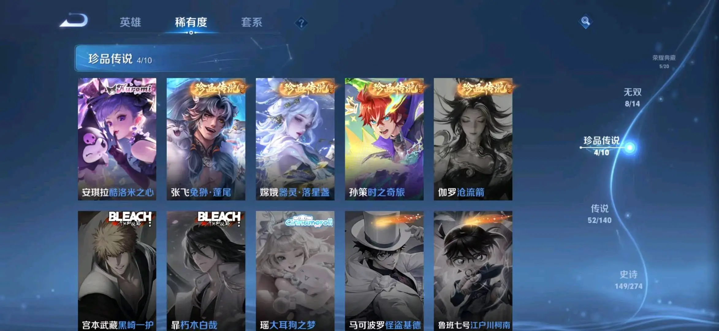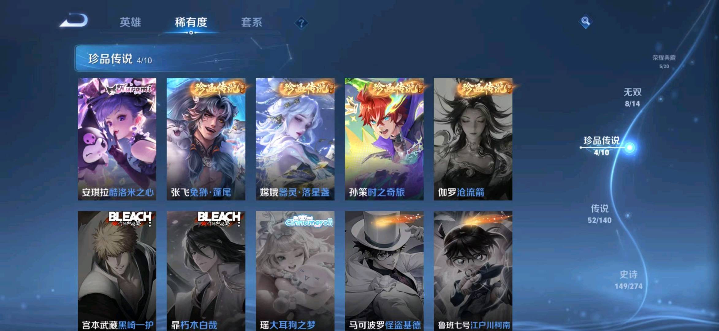 贵族等级V10,段位至尊星耀,英雄数量129,典藏皮肤数5,皮肤数量478,天魔缭乱/至尊宝/无限飓风号/白虎志/无相/器灵·螭龙剑/愿照·九州拓/愿照·众生和/冥王哈迪斯/神器·明辉仪/乘龙·问璇玑/群星魔术团(韩信)/落雪白狼/愿照·福禄聚/无双飞将/遇见神鼓/李逍遥/默契交锋(花木兰)/花合斗/神骥·赴朔漠/霜北刀/器灵·落星盏/琥珀纪元(马超)/神骥·鸣幻洲/至美·乘鲤谣/时之奇旅(孙策)/碎月剑心/愿照·千秋盛/乘龙·淬吴钩/东方月初/零号·赤焰/乘龙·铭钟鼎/埋骨钱/最初的交响/黄金天蝎座/兔狲·蓬尾/神骥·镇沧海/愿照·岁时盈/乘龙·聚宝船/问心剑/神威/启示之音/乘龙·忆丹青/九霄神辉/神树通天/青丘·九尾/银白咏叹调/愿照·山河定/酷洛米之心/时之魔女/傲雪梅枪/雪豹·霜爪/天魔缭乱/至尊宝/无限飓风号/白虎志/无相/器灵·螭龙剑/愿照·九州拓/愿照·众生和/冥王哈迪斯/神器·明辉仪/乘龙·问璇玑/群星魔术团(韩信)/落雪白狼/愿照·福禄聚/无双飞将/遇见神鼓/李逍遥/默契交锋(花木兰)/花合斗/神骥·赴朔漠/霜北刀/器灵·落星盏/琥珀纪元(马超)/神骥·鸣幻洲/至美·乘鲤谣/时之奇旅(孙策)/碎月剑心/愿照·千秋盛/乘龙·淬吴钩/东方月初/零号·赤焰/乘龙·铭钟鼎/埋骨钱/最初的交响/黄金天蝎座/兔狲·蓬尾/神骥·镇沧海/愿照·岁时盈/乘龙·聚宝船/问心剑/神威/启示之音/乘龙·忆丹青/九霄神辉/神树通天/青丘·九尾/银白咏叹调/愿照·山河定/酷洛米之心/时之魔女/傲雪梅枪/雪豹·霜爪