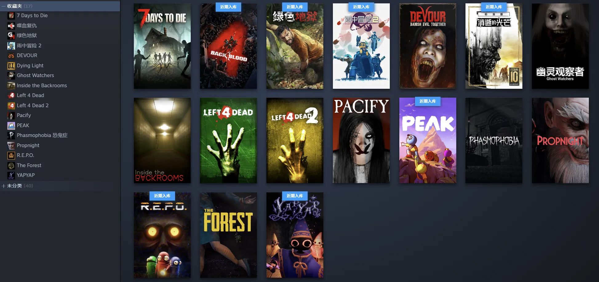 攀爬动物在一起(Climber Animals: Together)、PEAK(拉我一把)、雨中冒险2、魔法咒语/YAPYAP、喋血复仇、REPO、恐鬼症/幽灵恐怖(Phasmophobia)、道具夜/道具之夜(Propnight)、吞噬(DEVOUR)、安抚(Pacify)、后室攻略/深入后室(Inside The Backrooms)、消逝的光芒、幽灵观察者(Ghost Watchers)、迷失森林(The Forest)、七日杀/7日杀(7 Days to Die)、求生之路1,求生之路2(Left 4 Dead, Left 4 Dead 2)、绿色地狱/丛林地狱、杀戮尖塔1、杀戮尖塔2(Slay the Spire, Slay the Spire 2)