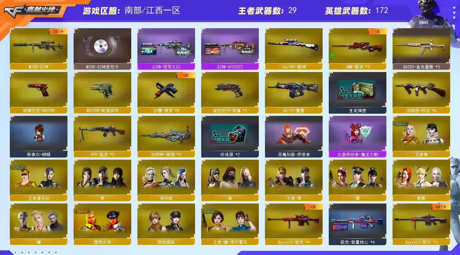 幻神三件套】【M200-幻神+音效卡+幻神-CFS2022+幻神-冠军之幻】【Kar98K-星神】【QBZ03-金色蔷薇】【生化 5盘龙 3炼狱 6烈龙 蝴蝶 死亡之眼】【裁决】【Barrett-毁灭+音效卡+毁灭-冠军之怒】【极光】【王者芳薇】【荣耀世冠套】【夜魔套】【AK47-火麒麟】【黑龙】【M4A1-雷神】【黑骑士+音效卡】【王者之幻 王者冰魄 王者之怒 王者之决】【无影 死神 黑武士 天启 机械迷城 hk417-朱雀 玫瑰精灵 海王 】【14手枪 修罗*5 天神*4 】【25近战 屠龙*2 龙啸*6 擎天*3 麒麟刺*4 斩神刀雷暴 王者之啸*3 王者之击】【手雷 雷霆雷 雷暴雷 堕天神 夜魔雷 电竞装甲】【四防 王者春 王者瞳闭月羞花 王者潘多拉】【幻神音效卡 Barrett-毁灭音效卡】