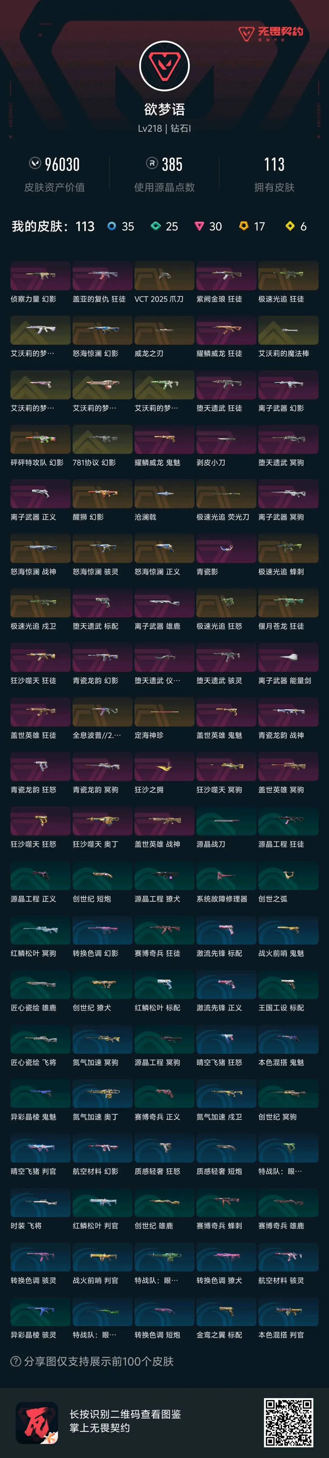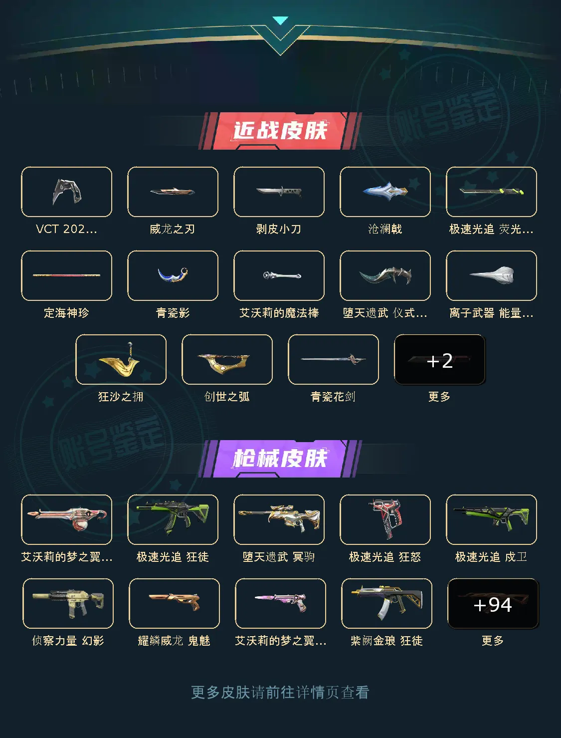 满级侦查幻影,满级怒海幻影,满级醒狮幻影,满级紫金狂徒,满级盖亚狂徒,满级显卡狂徒,满级偃月狂徒,满级堕天狂徒,满级全息狂徒,满级盖世狂徒,满级离子正义,满级威龙鬼魅,满级离子雄鹿,满级VCT爪刀,满级威龙之刃,满级沧澜戟,满级剥皮小刀,满级艾沃莉魔法棒,满级荧光刀,满级堕天匕首